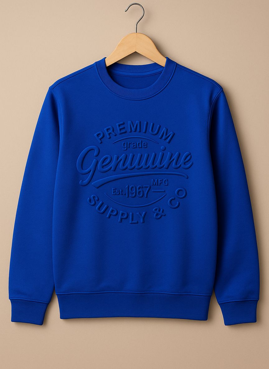 A vibrant blue sweatshirt featuring embossed text details, perfect for casual wear