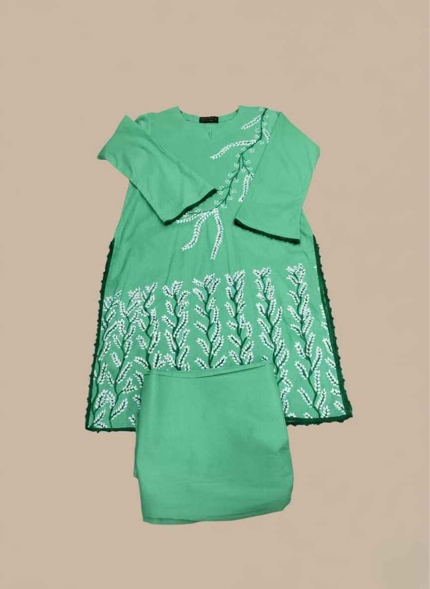 https://gelanigarments.pk/wp-admin/post.php?post=22694&action=edit2 pc hand painted cotton suit Pakistan is the ideal choice for women seeking a unique, artisanal look that stands out from mass-produced prints. This striking green suit is made from 100% pure cotton, ensuring a lightweight and airy feel suitable for the Pakistani climate. The shirt showcases delicate white hand-painted vines flowing across the neckline and bottom panels, complemented by matching green lace edging for a premium finish.