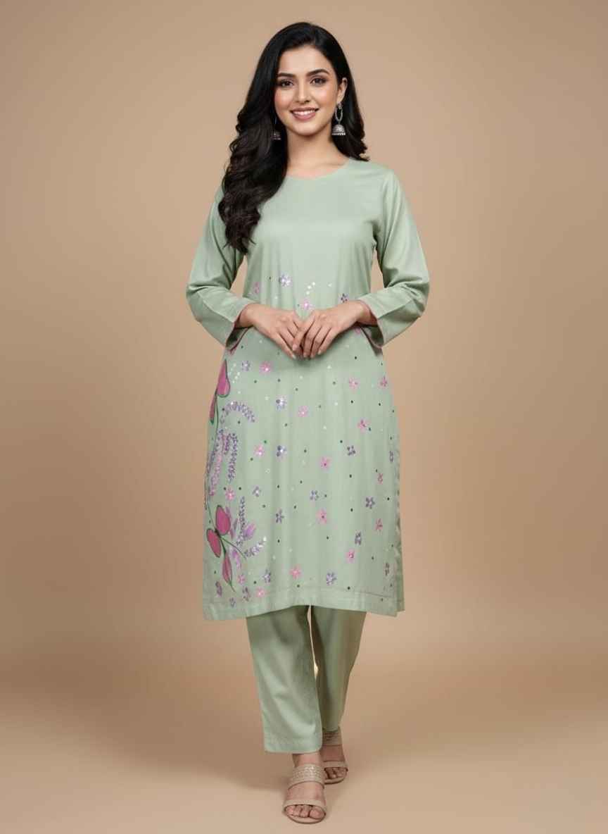 • Refreshing Pista Color: A trendy and soothing pista green shade that brings a fresh vibe to your seasonal wardrobe.