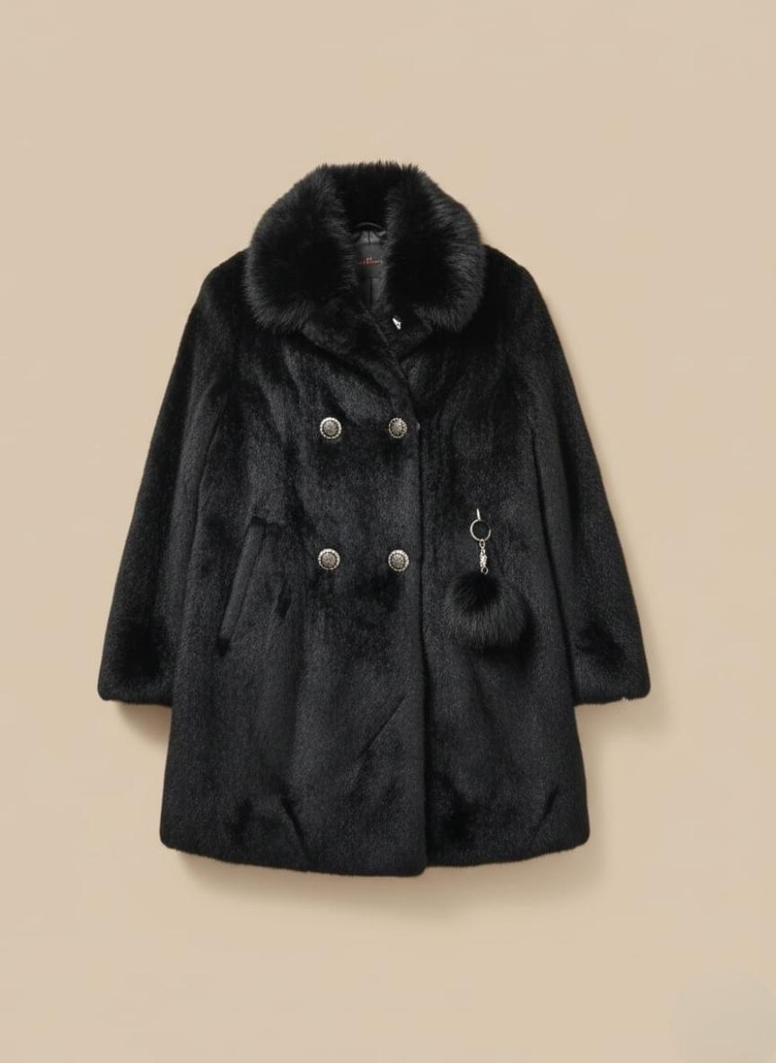 This beautifully tailored coat is crafted from a rich, textured wool blend that provides both exceptional warmth and a luxurious feel. The standout feature is the plush, voluminous faux fur collar in a complementary reddish-brown shade, adding a touch of vintage glamour and framing the face beautifully. A delicate, ornamental white brooch secures the collar at the neck, offering a unique and elegant focal point. The coat features a flattering A-line silhouette that drapes gracefully, enhanced by two rows of three decorative white buttons positioned at the hips, giving it a classic, structured look.