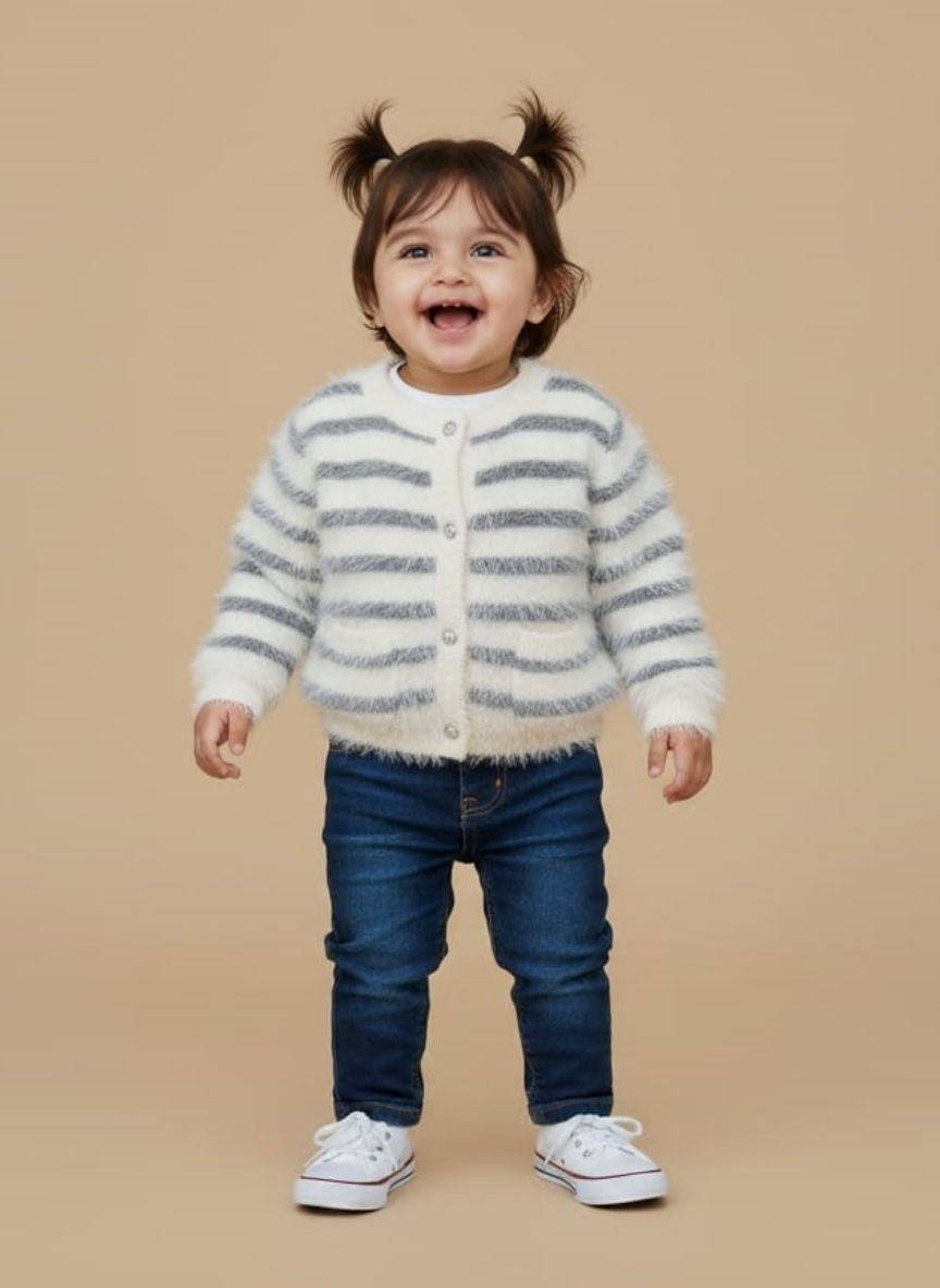 Adorable fluffy striped toddler sweater for girls in white and grey. Soft knit with button-up front, perfect for cozy layering and everyday style.