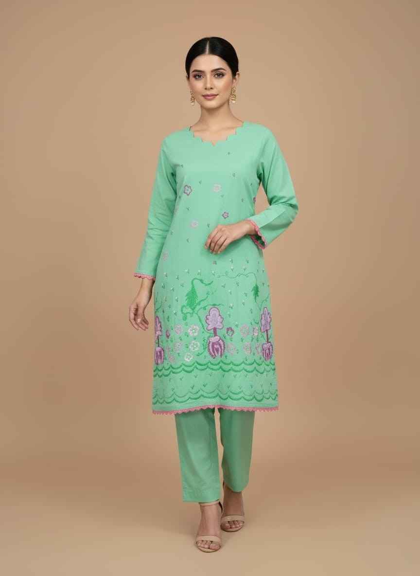 Elevate your ethnic wardrobe with our exquisite hand painted cotton suit pakistan. This 2-piece light green ensemble is crafted from high-quality, breathable cotton and features intricate floral hand-painting. Designed in a versatile free size, it offers a perfect blend of traditional craftsmanship and modern style for the fashion-forward woman in Pakistan.