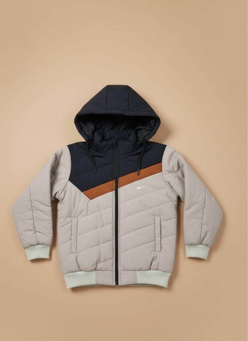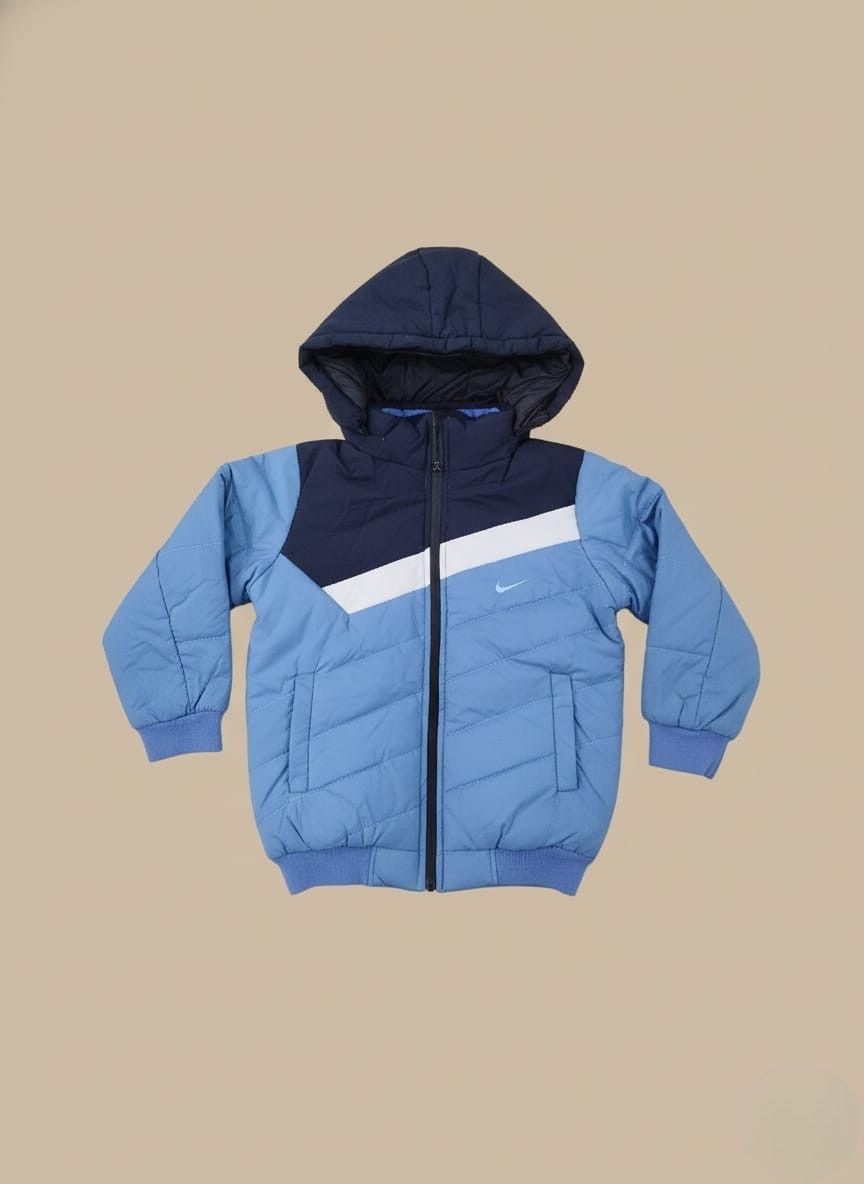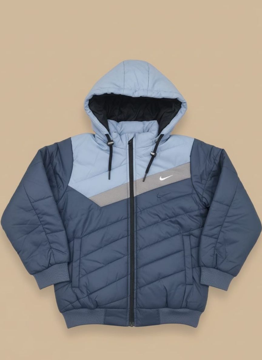 Elevate your outerwear collection with this premium, chevron-panelled Nike puffer jacket. Designed for exceptional warmth without the bulk, this insulated coat is perfect for chilly weather, outdoor activities, or simply everyday style. The jacket features a dual-tone design in shades of blue and gray, offering a modern, sporty aesthetic. The fixed hood provides extra coverage against wind and rain, while the full-zip closure ensures easy layering. Quilted construction helps to evenly distribute the lightweight insulation, keeping you cozy on cold days.