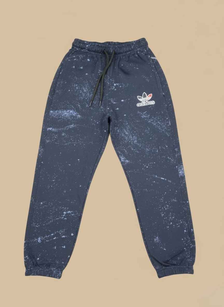 Our design focuses on durability and style. The navy blue base is accented with a modern “galaxy” spatter effect, making them stand out from plain tracksuits. The ribbed cuffs ensure a snug fit around the ankles to keep the cold air out.
