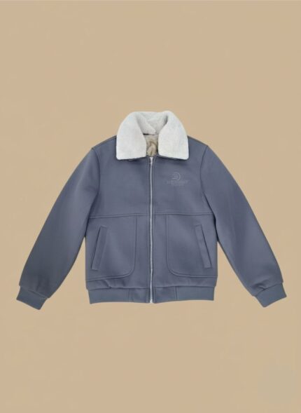 Men's Sherpa Lined Suede Jacket, deep blue-grey color, with white sherpa fleece collar and lining visible, full zip, chest pockets, warm winter coat.
