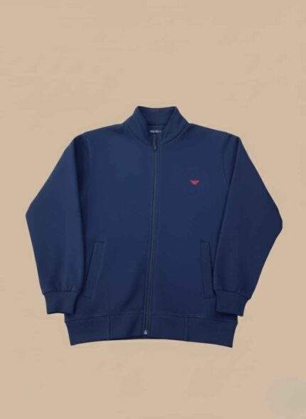 Navy blue wool jacket for men with front zipper and red logo. Gelani's brand stitched wool jacket for winter in Pakistan. Front view of a minimalist navy blue men's wool jacket. High-neck wool jacket for men in navy blue color with ribbed cuffs. Premium winter outerwear for men featuring soft wool material. wool jacket for men
