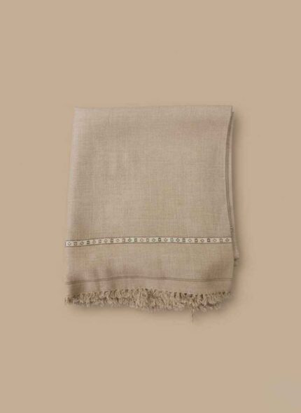 Gelani's off-white whool shawl for men with traditional patterned border Close up of stitched wool fabric texture for men's winter shawl Men's black wool shawl folded neatly for winter collection Pakistan Traditional Pakistani men's shawl in tea pink with detailed embroidery Premium wool winter wrap for men by Gelani's brand whool shawal for men