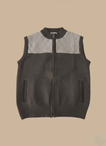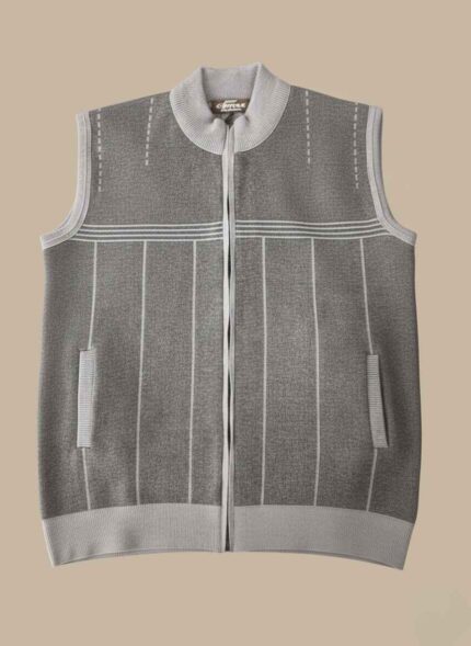Main Image: Front view of Gelani's gray Sleveless Sweater for Men with full zipper and high neck. Detail Image: Close-up of Climax Knitwear brand label and ribbed collar on the gray wool vest. Pattern Detail: Stitched vertical pinstripe design and horizontal accents on the front of the men's sweater. Pocket View: Side-entry pockets with dark gray contrast trim on the wool winter vest. Texture Shot: High-quality gray wool knit texture of the sleeveless men's zipper sweater.