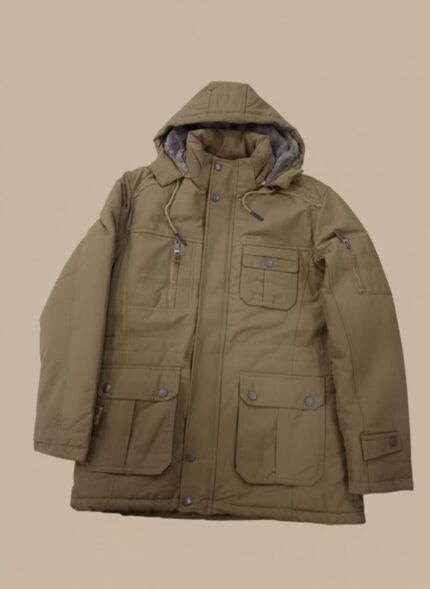 Front view of a brown fleece jacket for men with four front pockets. Stitched winter jacket for men with a fur-lined hood in brown color. Close-up of the zipper and button detail on a male fleece winter coat. Jacket brand brown fleece outerwear for men showing cargo pockets. Warm stitched fleece jacket for men suitable for Pakistan winter season. fleece jacket for men