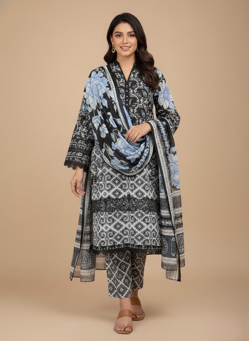 Elevate your summer wardrobe with our exquisite 3 PC Unstitched Lawn Fabric collection, designed for the modern woman who values comfort and style. This versatile set features two unique prints: a stunning black base with elegant blue and white floral patterns, perfect for a sophisticated look, and a chic white base with intricate black geometric designs, ideal for a contemporary touch. Made from premium quality lawn fabric, known for its breathability and lightweight feel, these unstitched suits offer endless possibilities for customization. Craft your perfect outfit – whether it’s a traditional shalwar kameez, a trendy long shirt, or a stylish tunic – tailored precisely to your measurements. The 3 PC Unstitched Lawn Fabric includes shirt, shalwar, and dupatta material, ensuring a complete ensemble. Ideal for daily wear, casual outings, or semi-formal occasions, this collection promises both comfort and a fashion-forward statement. Explore the latest trends in unstitched lawn fabric and create your unique style this season.