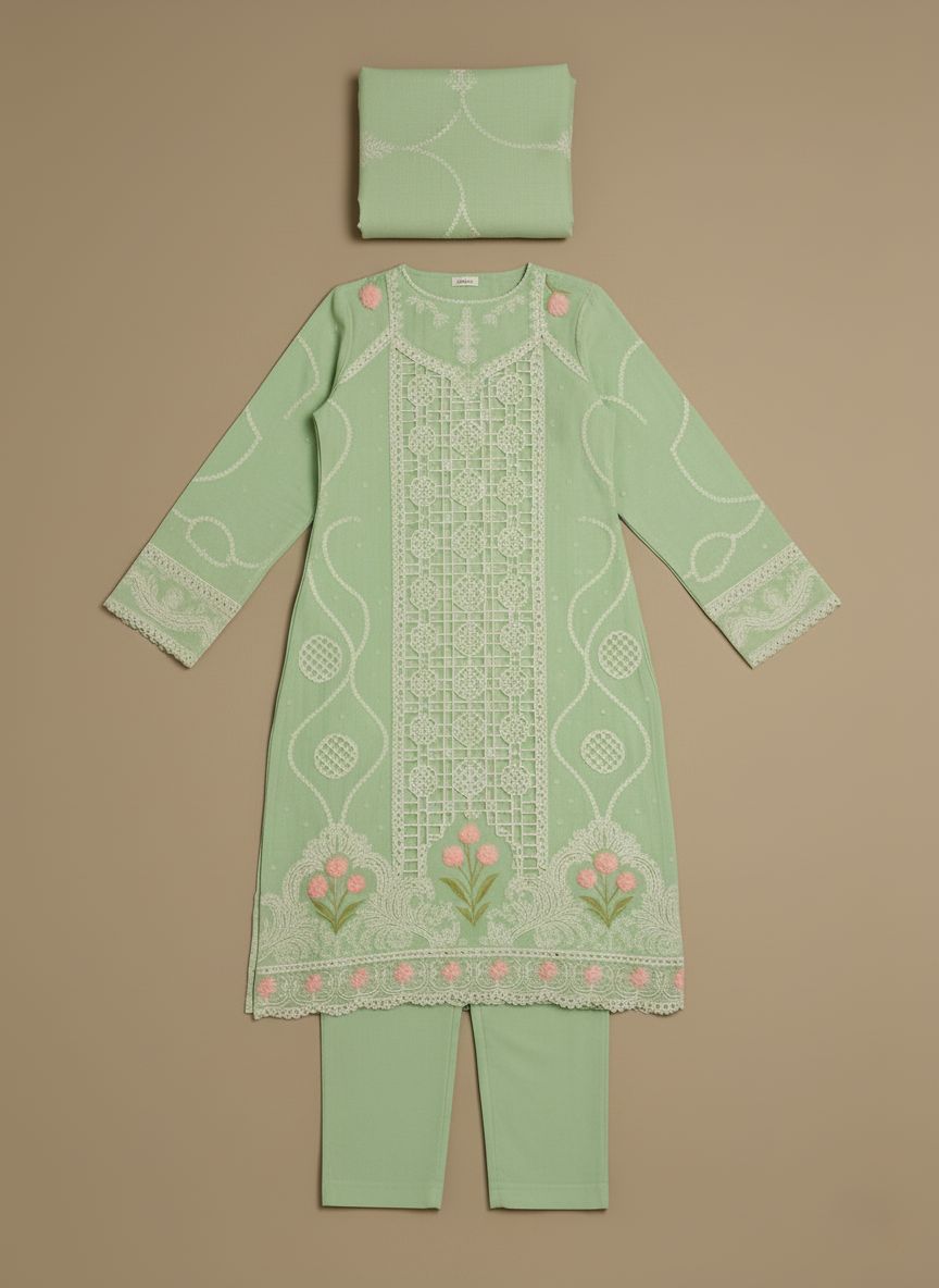 3-Piece Embroidered Kameez Shalwar Set, symmetrical patterns and delicate lace detailing on the sleeves and borders add a touch of finesse