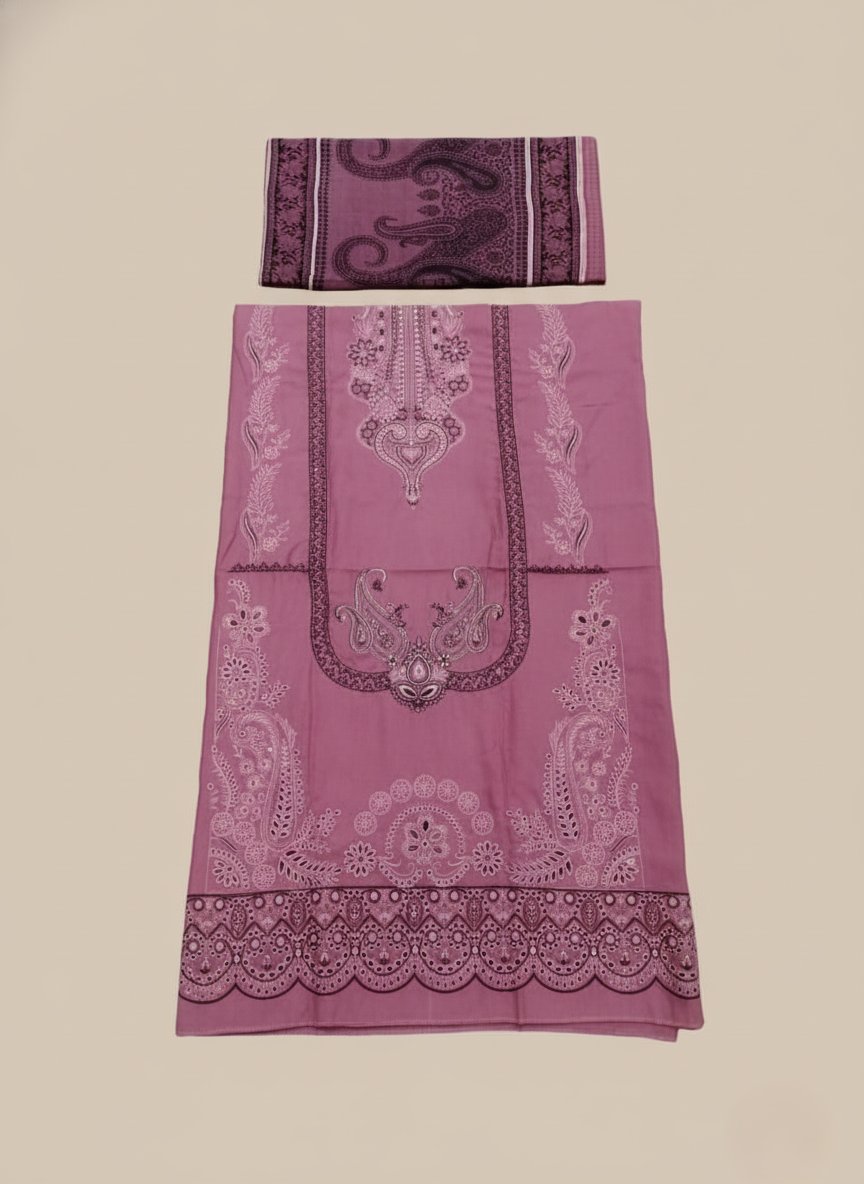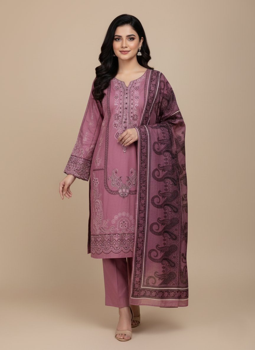 Premium Marina 3 Piece Unstitched Suit with elegant embroidery, perfect for winter. Customize your look with this comfortable and stylish Marina suit.