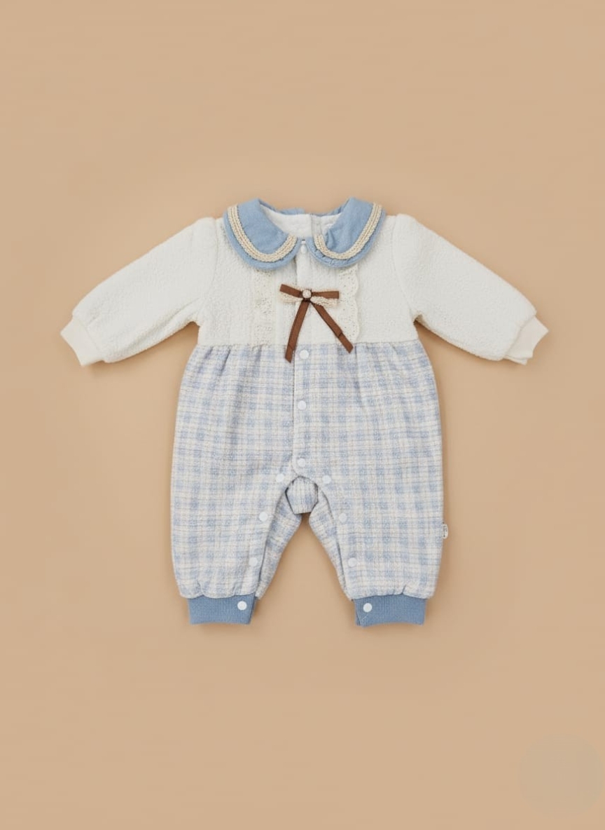 Dress your little one in charming style with our adorable baby romper. This delightful one-piece outfit features a soft, textured white knit top half, beautifully contrasted with a light blue plaid pattern on the bottom. Designed for ultimate comfort and cuteness, this baby romper boasts a lovely blue crochet-trimmed Peter Pan collar and delicate lace detailing across the chest. A sweet brown bow accent with a pearl-like embellishment adds a touch of classic elegance. Crafted from gentle, breathable fabrics, this infant romper ensures your baby stays cozy and comfortable all day long. Snap closures along the inseam and down the front make for easy diaper changes and dressing. The long sleeves and comfortable fit are perfect for various occasions, from special outings to everyday wear. This charming baby romper makes an excellent gift for newborns and infants, blending classic design with practical functionality.