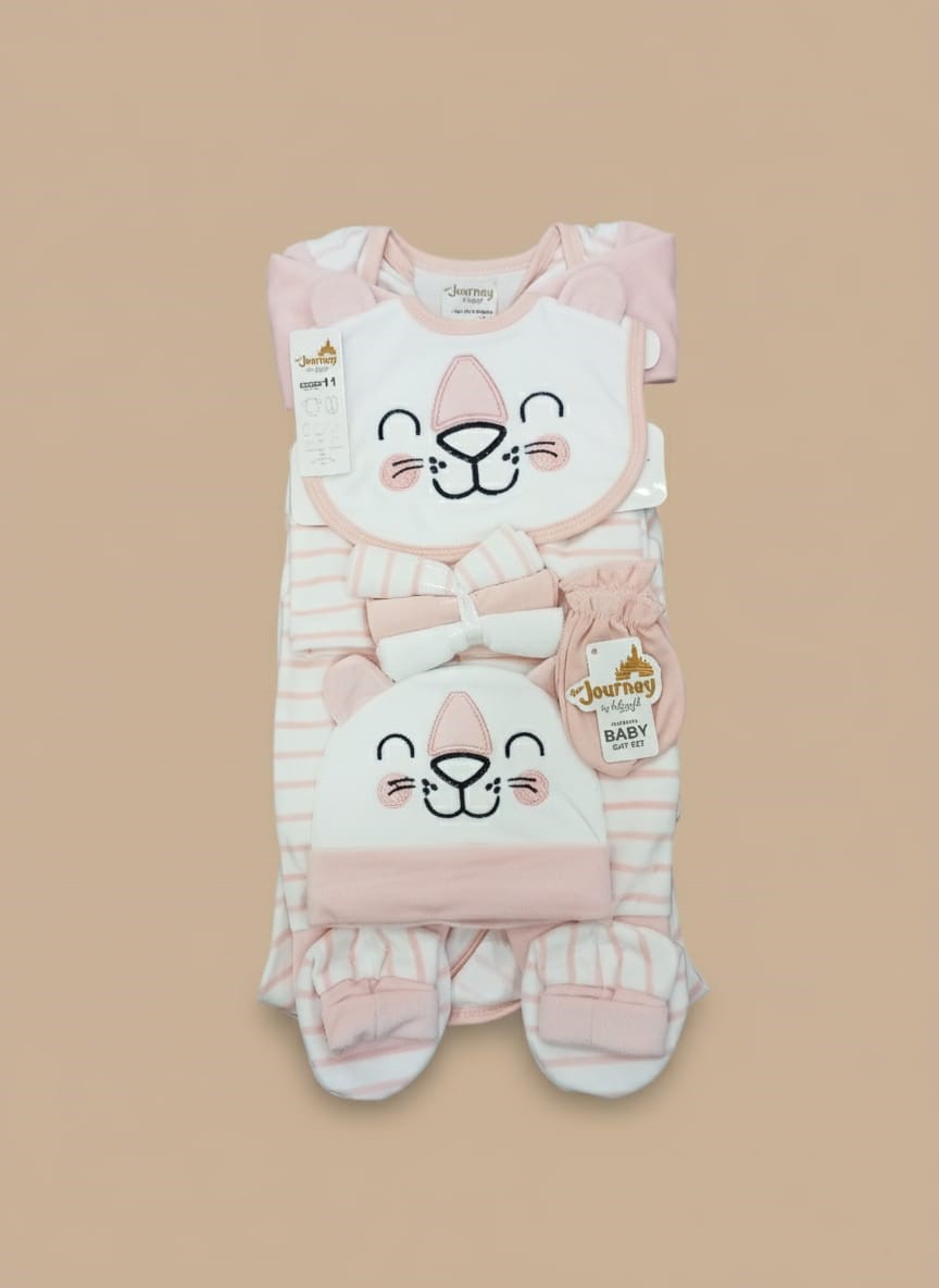 Dress your little one in comfort and style with our adorable Pink Striped Baby Girl Layette Set. This 5-piece starter set is perfect for newborns, offering a complete outfit that’s both practical and irresistibly cute. Crafted from soft, breathable cotton, the set includes a long-sleeve bodysuit with sweet pink stripes, coordinating footed pants, a charming bib featuring a smiling animal face, a matching headband with a bow, and cozy mittens to keep tiny hands warm.