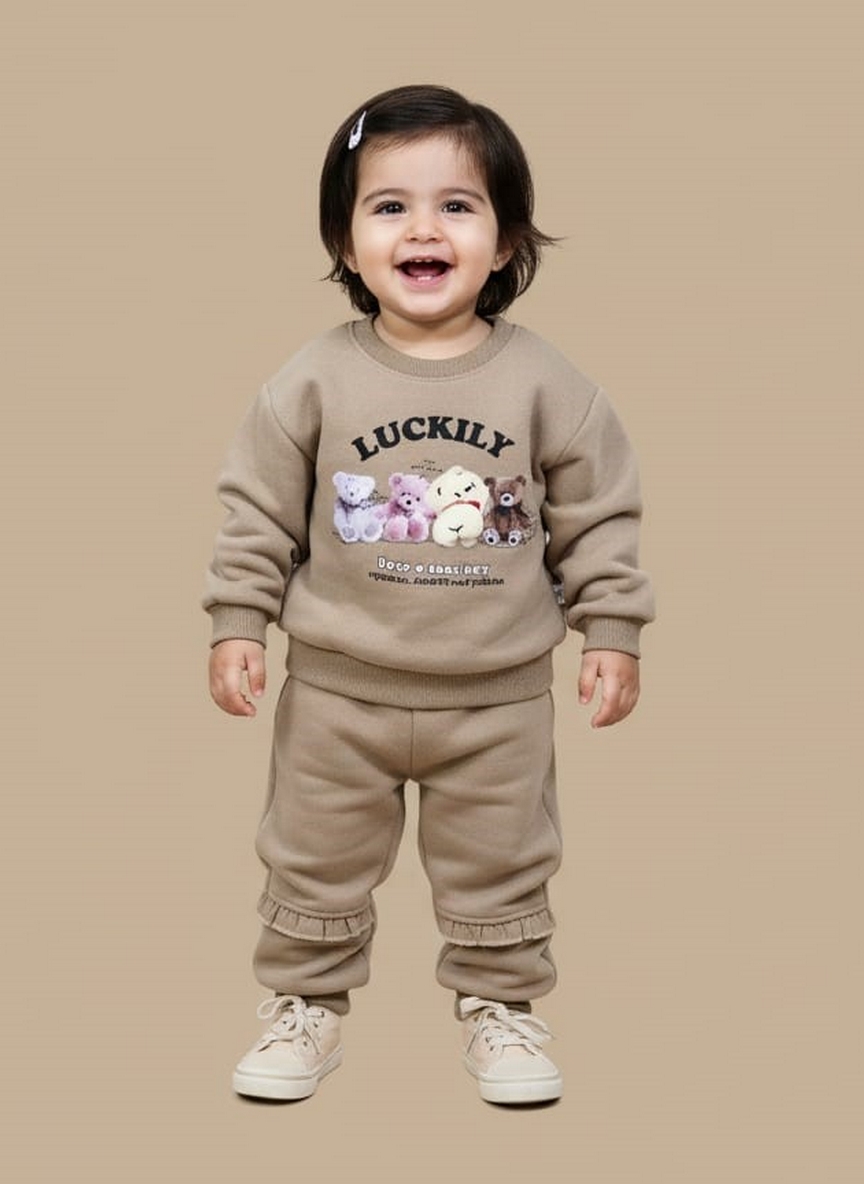 Dress your little one in cozy comfort with our adorable Brown Tracksuit! This charming 2-piece set is perfect for infants and toddlers, featuring a soft brown sweatshirt with a sweet print and an array of cute teddy bear graphics. Paired with matching brown joggers that include ruffled cuffs for an extra touch of cuteness, this Brown Tracksuit offers both style and warmth. Made from gentle, comfortable fabric, it’s ideal for everyday wear, playdates, or simply keeping your baby snug during cooler weather. The easy pull-on design ensures hassle-free dressing, making it a favorite for parents and babies alike. A delightful addition to any baby’s casual wardrobe.
