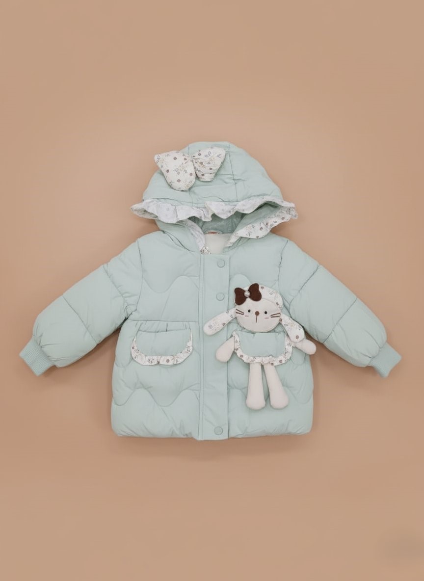 Dress your little one in cozy comfort and charming style with our Baby Girls Quilted Jacket. This adorable mint green puffer coat is designed to keep your baby warm and snug during cooler days. Featuring a delightful quilted pattern, it offers both insulation and a touch of elegance. The jacket comes with a practical hood adorned with a sweet floral bow, adding an extra layer of warmth and cuteness. A playful bunny plush toy is attached, making it a favorite for both parent and child. Crafted from soft, durable materials, this Baby Girls Quilted Jacket ensures maximum comfort for your precious one. It’s perfect for everyday wear, outdoor adventures, or as a thoughtful gift. Available in various sizes, this mint green puffer coat is a must-have addition to your baby girl’s wardrobe.