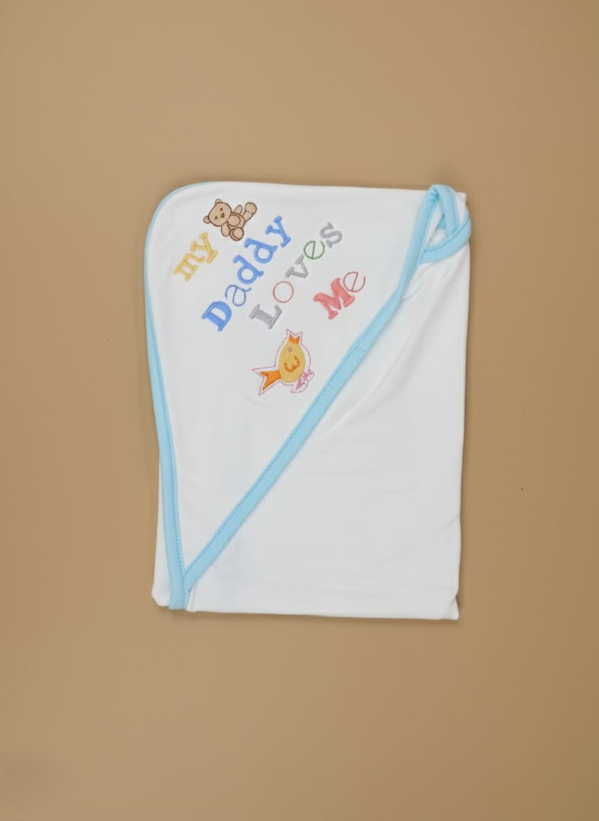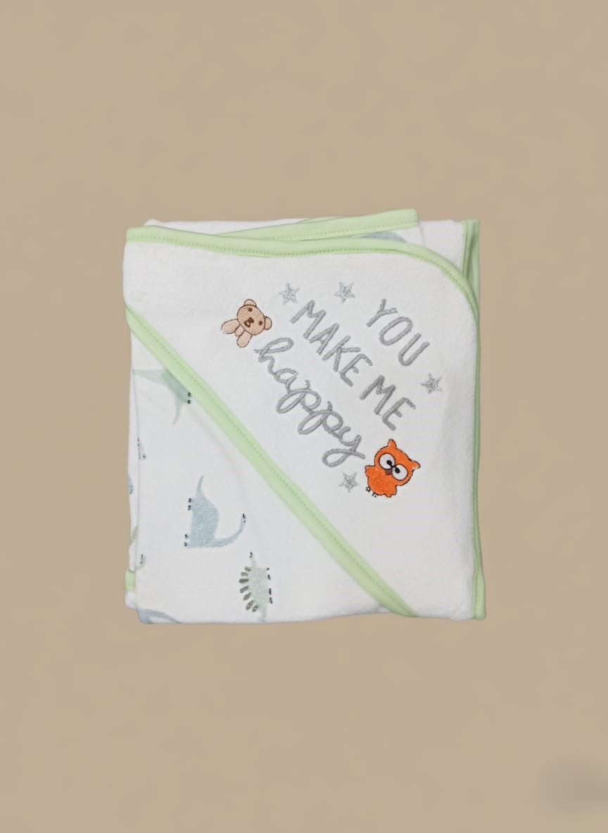 Soft and secure baby swaddle blanket featuring “YOU MAKE ME HAPPY” embroidery and cute animal details, perfect for cozy newborn comfort.