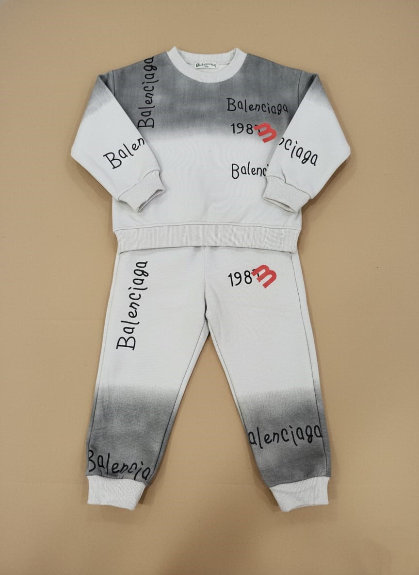 Trendy Kids Tie-Dye Tracksuit with a grey and white gradient sweatshirt and joggers, featuring “Balenciaga” branding and “1983” graphic.