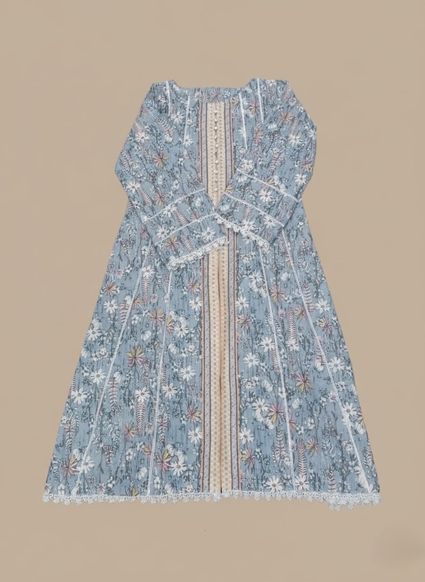 Elegant blue floral printed frock for women, featuring long sleeves and delicate lace detailing. A comfortable and stylish dress perfect for any occasion.