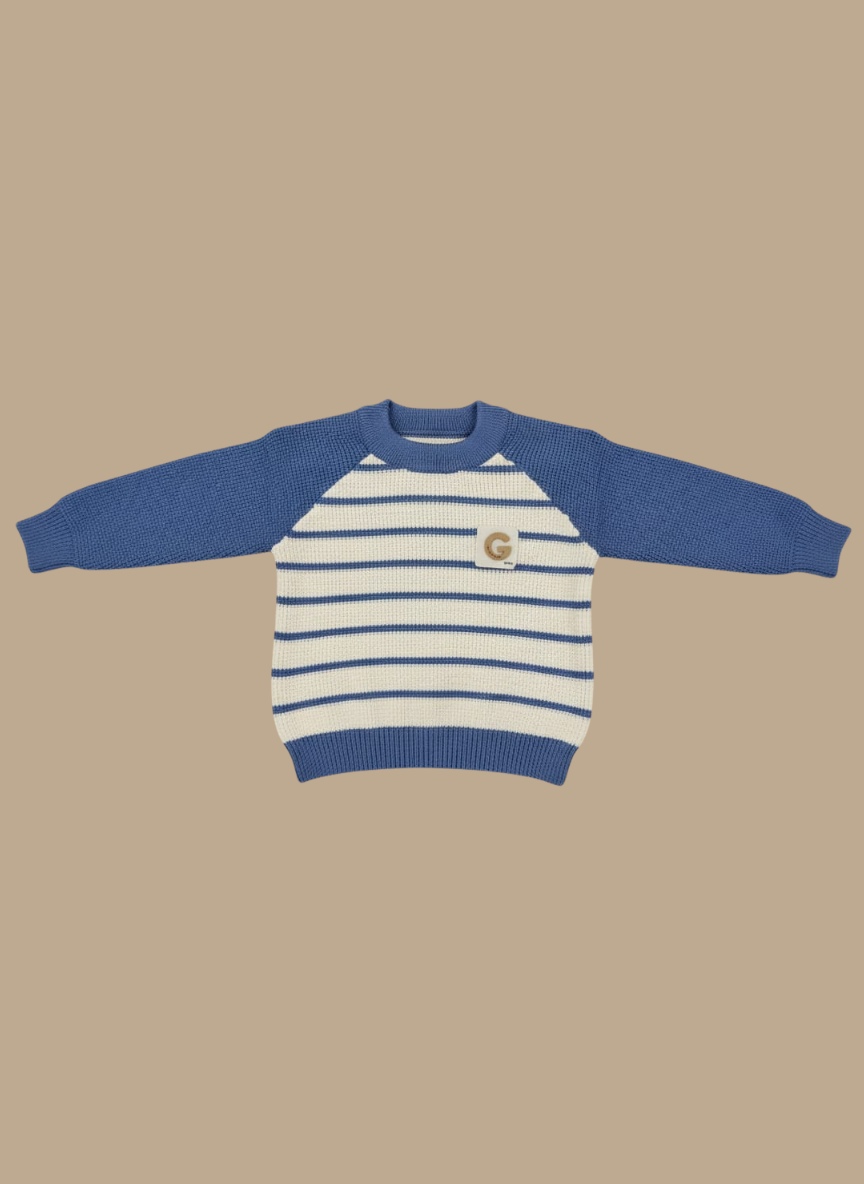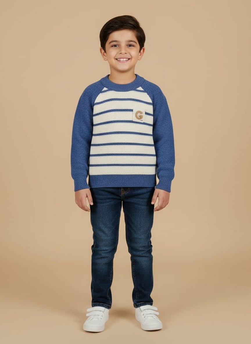 Dress your little one in style and comfort with our charming Kids Blue Striped Sweater. This cozy crew neck sweater features a classic blue and off-white striped design across the chest, complemented by solid blue raglan sleeves. Crafted from a soft, durable cotton blend, it’s perfect for everyday wear, providing warmth without sacrificing freedom of movement. The ribbed cuffs and hem ensure a snug fit, while the small, tasteful “G” emblem adds a touch of unique detail. Ideal for cool weather, school days, or casual outings, this versatile sweater is a must-have addition to any young boy’s wardrobe.