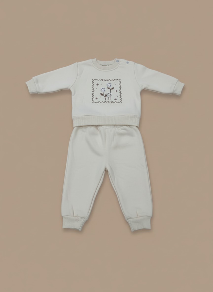 Dress your little one in delicate comfort with our Charming Baby Floral Embroidered Sweater & Jogger Set. This adorable two-piece outfit features a soft, cream-colored sweater adorned with exquisite floral embroidery in a rustic frame design. The subtle, elegant detailing adds a touch of natural beauty to this cozy top. Paired with matching cream jogger pants, this set provides ultimate comfort and flexibility for your baby’s everyday adventures. Crafted from a gentle, breathable fabric, this baby floral embroidered sweater set is perfect for keeping your infant snug and stylish in any season. It’s a versatile, gender-neutral choice that makes a thoughtful baby shower gift or a lovely addition to your little one’s wardrobe. Experience the perfect blend of style and comfort.