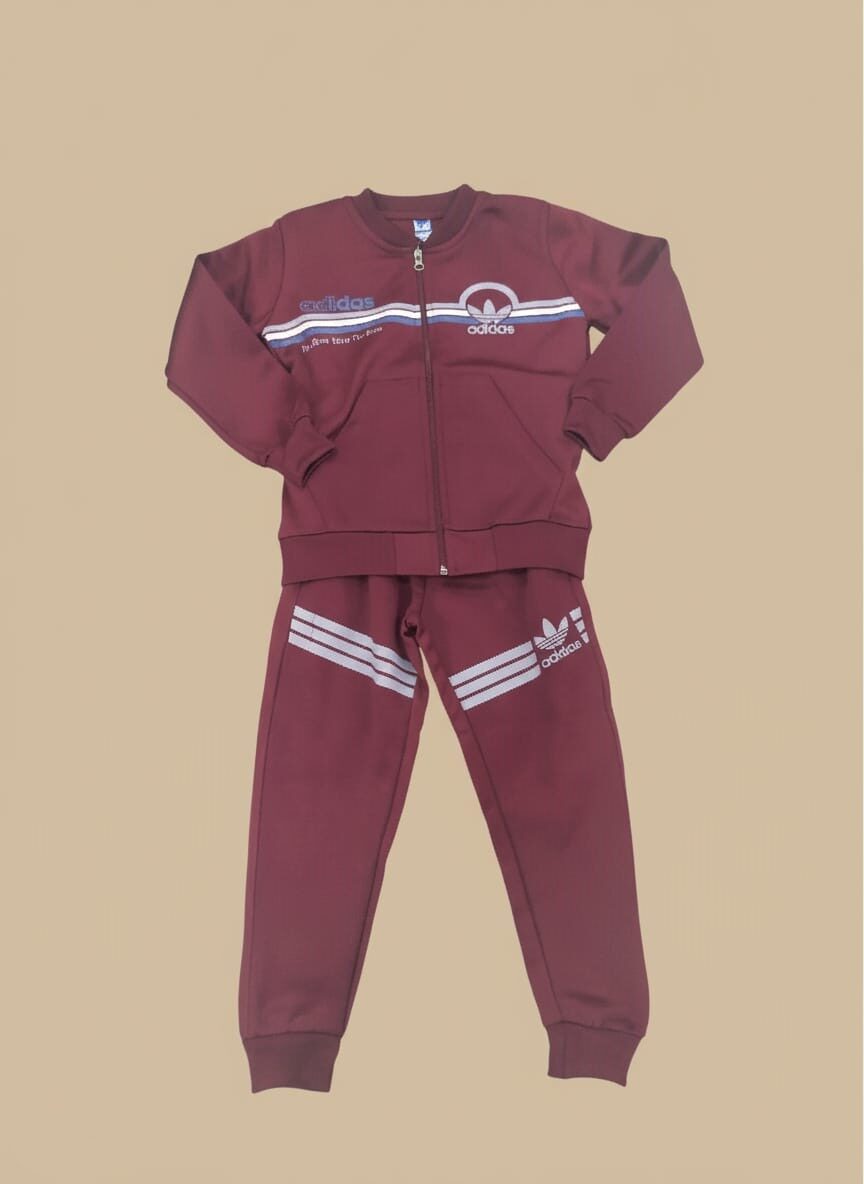 Classic maroon boys sports tracksuit featuring a full-zip jacket and matching joggers with sporty stripes. Comfortable and stylish for active kids.