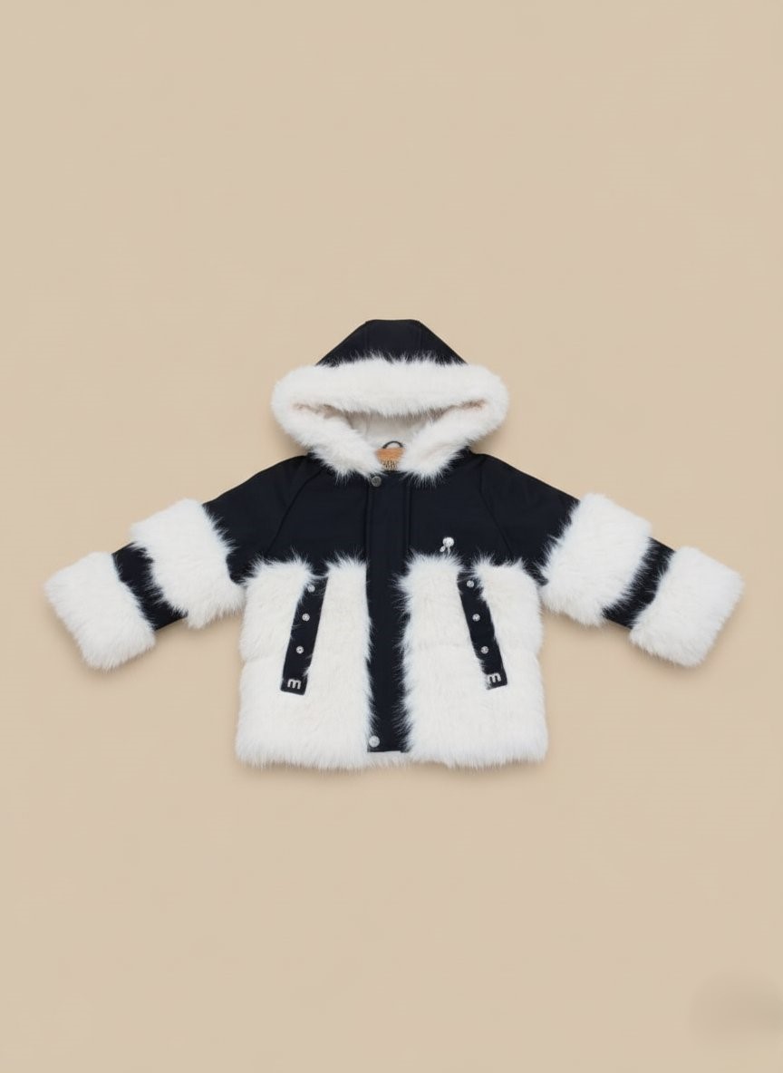 Keep your child warm and stylish with this adorable black and white kids faux fur hooded jacket. Soft, cozy, and perfect for winter adventures, this coat combines comfort with a chic design.