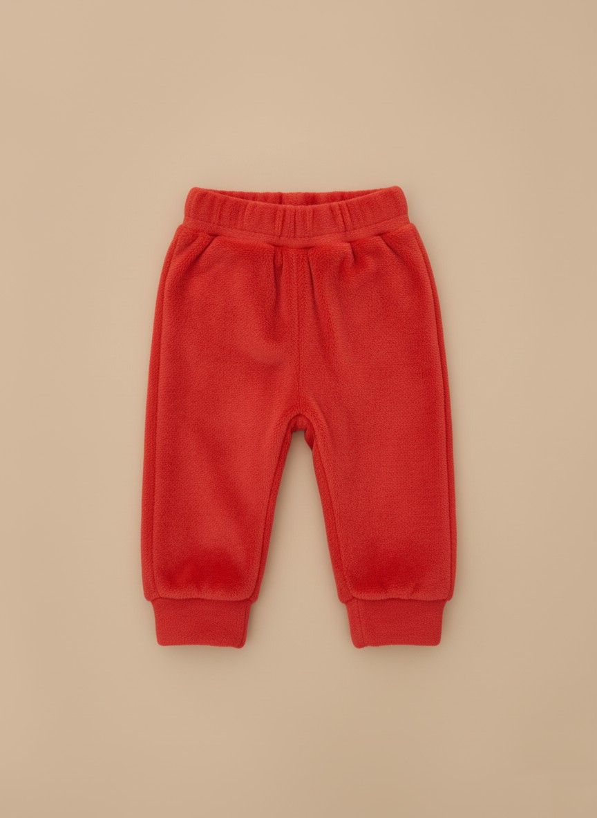 Soft and warm red toddler fleece pants with an elastic waist and ribbed cuffs, perfect for cozy everyday wear.