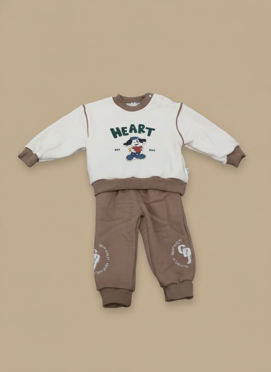 Adorable two-piece Baby Heart Dog Sweater and Jogger Set. Features a cream sweater with a dog graphic and comfy brown joggers. Perfect for cozy days.