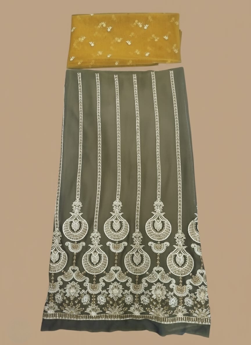 - The fabric, likely a premium Chiffon or Organza, is adorned with delicate embroidery (e.g., in gold, silver, or soft beige thread) that complements the earthy hue without overpowering it. This meticulous detailing lends the suit a quiet luxury and traditional charm, making it suitable for evening dinners, receptions, and elegant gatherings.