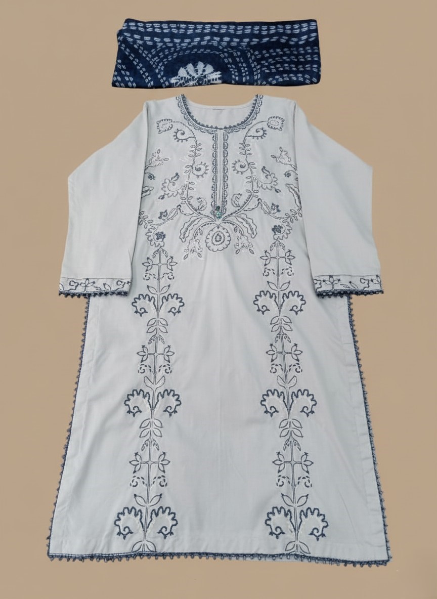 Discover our beautiful 3 Piece Lawn Suit, featuring intricate embroidery on a soft lawn fabric. This set includes a matching tie & dye dupatta, perfect for a chic and comfortable look.