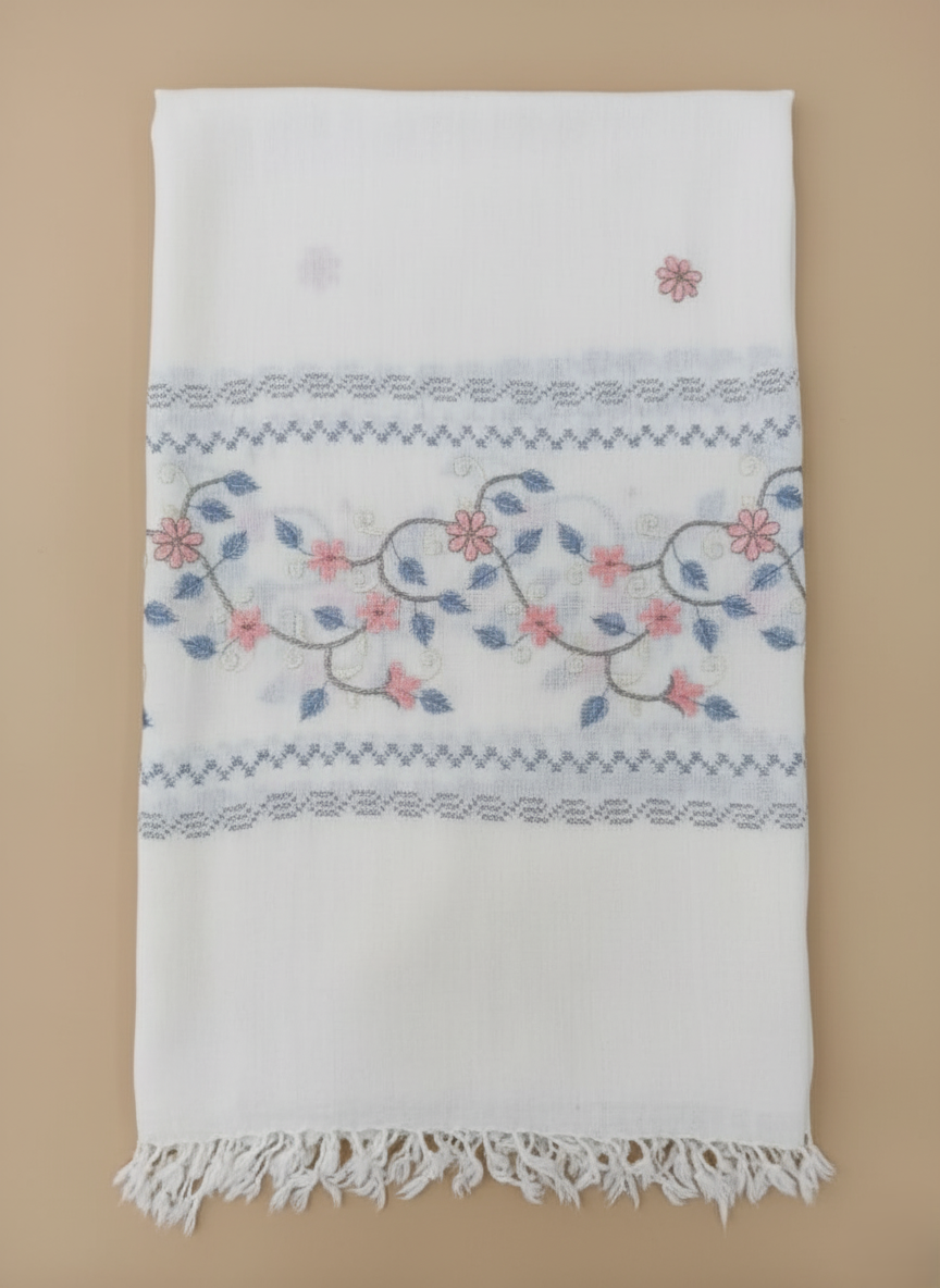 Wrap yourself in elegance with our exquisite Embroidered Floral Shawl, a perfect blend of tradition and modern style. This lightweight and soft shawl features delicate floral embroidery in beautiful pink and blue hues, creating a captivating design that enhances any outfit. Crafted from high-quality, breathable fabric, it offers comfortable wear throughout the seasons. The intricate floral pattern, combined with subtle border detailing, makes this shawl a versatile accessory for both casual and formal occasions. Whether you’re looking for a chic addition to your evening wear or a stylish cover-up for a cooler day, this beautifully embroidered shawl provides warmth, comfort, and timeless sophistication. Its generous size allows for various styling options, making it a must-have for every woman’s wardrobe. Experience the blend of artisanal craftsmanship and contemporary fashion with our stunning floral embroidered shawl.