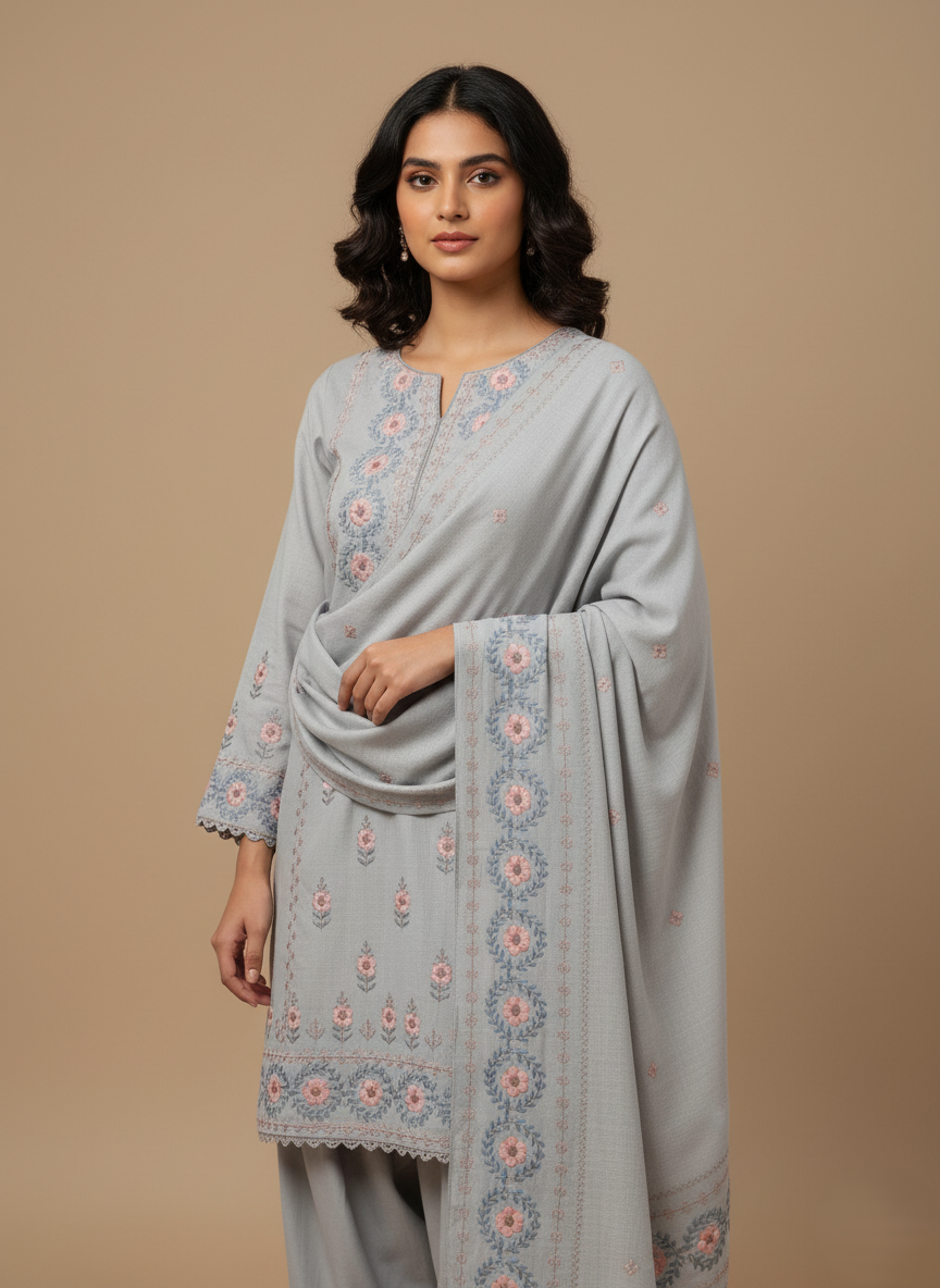 Wrap yourself in timeless elegance with our exquisite floral embroidered shawl. Crafted from a luxurious, soft grey fabric, this shawl features intricate machine embroidery showcasing charming pink and blue floral motifs intertwined with delicate leaf patterns. The meticulous detailing creates a sophisticated border design, making this embroidered shawl a perfect accessory for any occasion. Whether draped over your shoulders for a formal event or adding a touch of grace to your everyday attire, its versatile design and comfortable feel will make it a cherished addition to your wardrobe. This high-quality embroidered shawl measures [insert dimensions here, e.g., 70 x 200 cm] and is ideal for all seasons, providing a lightweight yet warm embrace. A beautiful gift idea, this embroidered shawl combines traditional craftsmanship with contemporary style