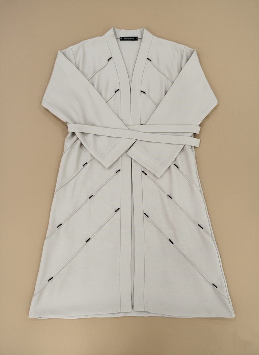 Chic grey modest abaya dress featuring a belted waist and elegant stitching details. Perfect for sophisticated Islamic fashion. Wear as a stylish modest sweater.