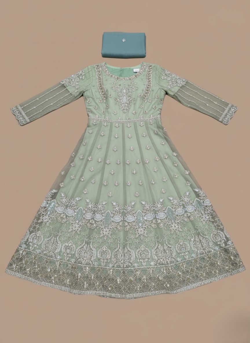 Step into sophistication with our exquisite Sage Green Embroidered Net Anarkali Maxi Gown. This stunning ensemble is crafted from delicate net fabric, featuring intricate silver and sage green embroidery throughout the bodice, sleeves, and a lavish border along the maxi hem. The flowing Anarkali silhouette offers a graceful and flattering fit, perfect for special occasions, weddings, or festive gatherings. The long sleeves are adorned with delicate embroidery, adding to its elegant appeal. This beautiful maxi gown comes complete with a matching sage green dupatta, providing a cohesive and polished look. Embrace timeless style and comfort with this meticulously designed maxi, ensuring you stand out with unparalleled grace.