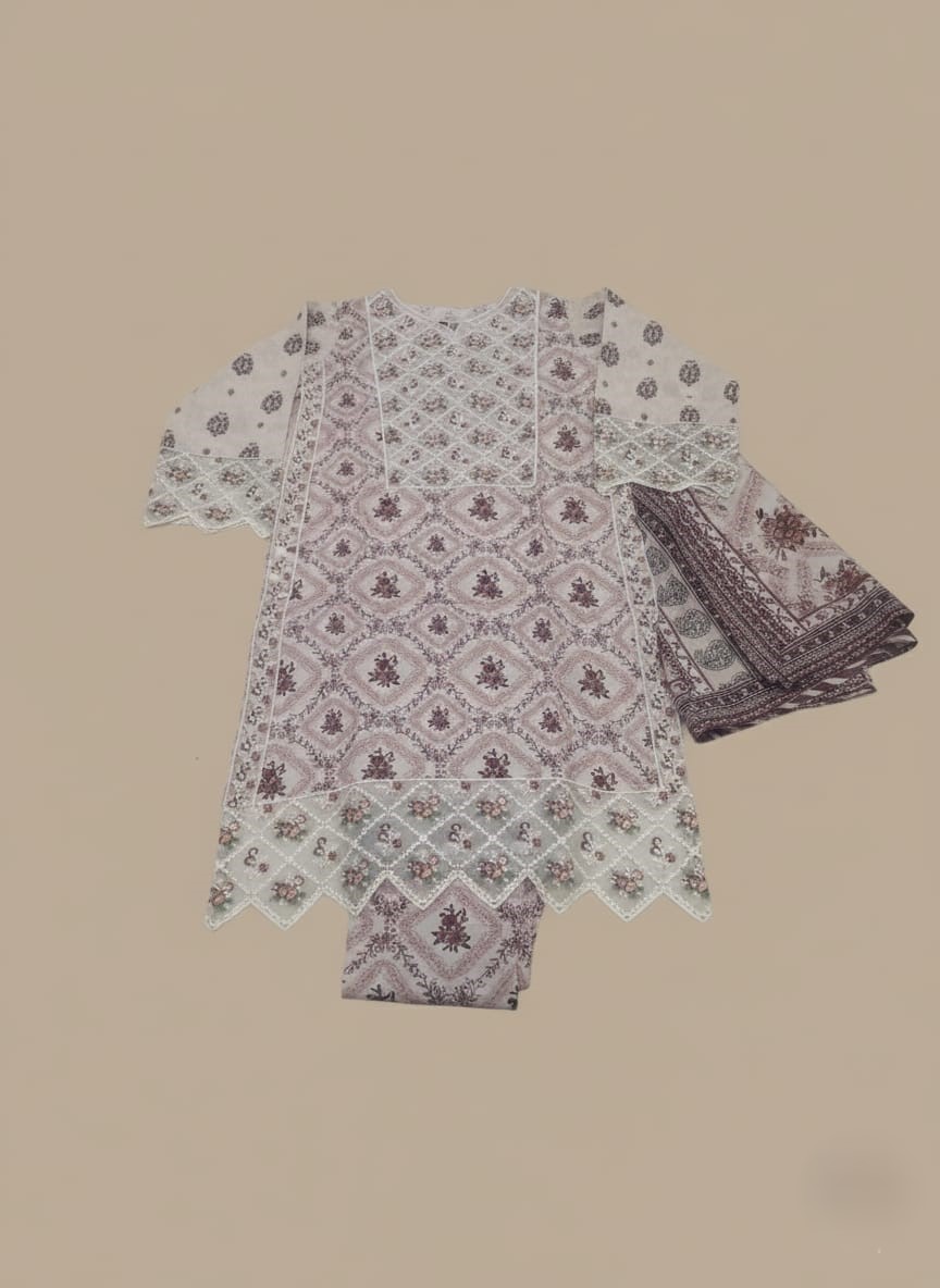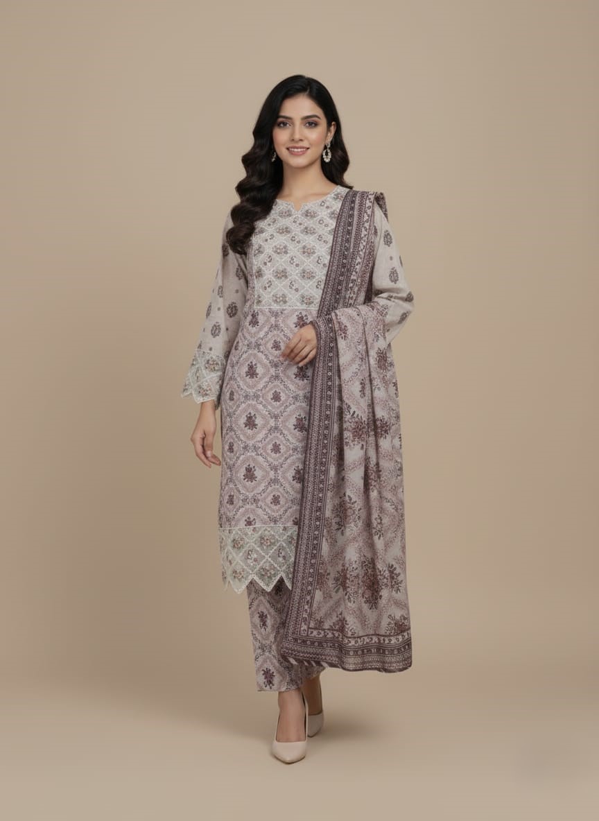 Embrace subtle elegance with our beautiful Women’s Printed Suit, an exquisite choice for sophisticated daily wear, cultural events, or casual gatherings. This charming 3-piece ensemble features a light beige long tunic (kameez) with intricate maroon geometric and floral patterns, creating a delicate yet captivating design. The tunic is highlighted with subtle lace detailing on the cuffs and hem, adding a touch of refined grace. It is perfectly complemented by matching patterned trousers (shalwar) and a flowing, coordinating printed dupatta (scarf) with a striking border, completing the harmonious look. Crafted from comfortable, breathable fabric, this Women’s Printed Suit ensures both ease of wear and a flattering silhouette, allowing you to move with confidence and style.
