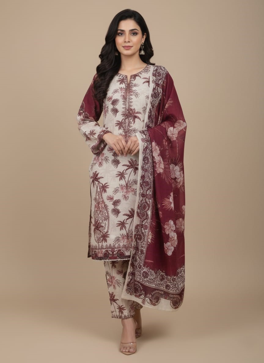 Embrace sophisticated charm with our elegant Women’s Printed Suit, a perfect choice for casual outings, festive gatherings, or stylish daily wear. This beautiful 3-piece ensemble features a white long tunic (kameez) adorned with a chic maroon palm tree and floral print, creating a refreshing yet traditional aesthetic. The tunic boasts intricate patterns along the neckline and hem, enhancing its refined look. It is perfectly complemented by matching white patterned trousers (shalwar) and a rich maroon dupatta (scarf) with a contrasting white border, echoing the suit’s delicate prints. Crafted from comfortable, breathable fabric, this Women’s Printed Suit ensures both ease of wear and a graceful silhouette, allowing you to move with confidence and style.
