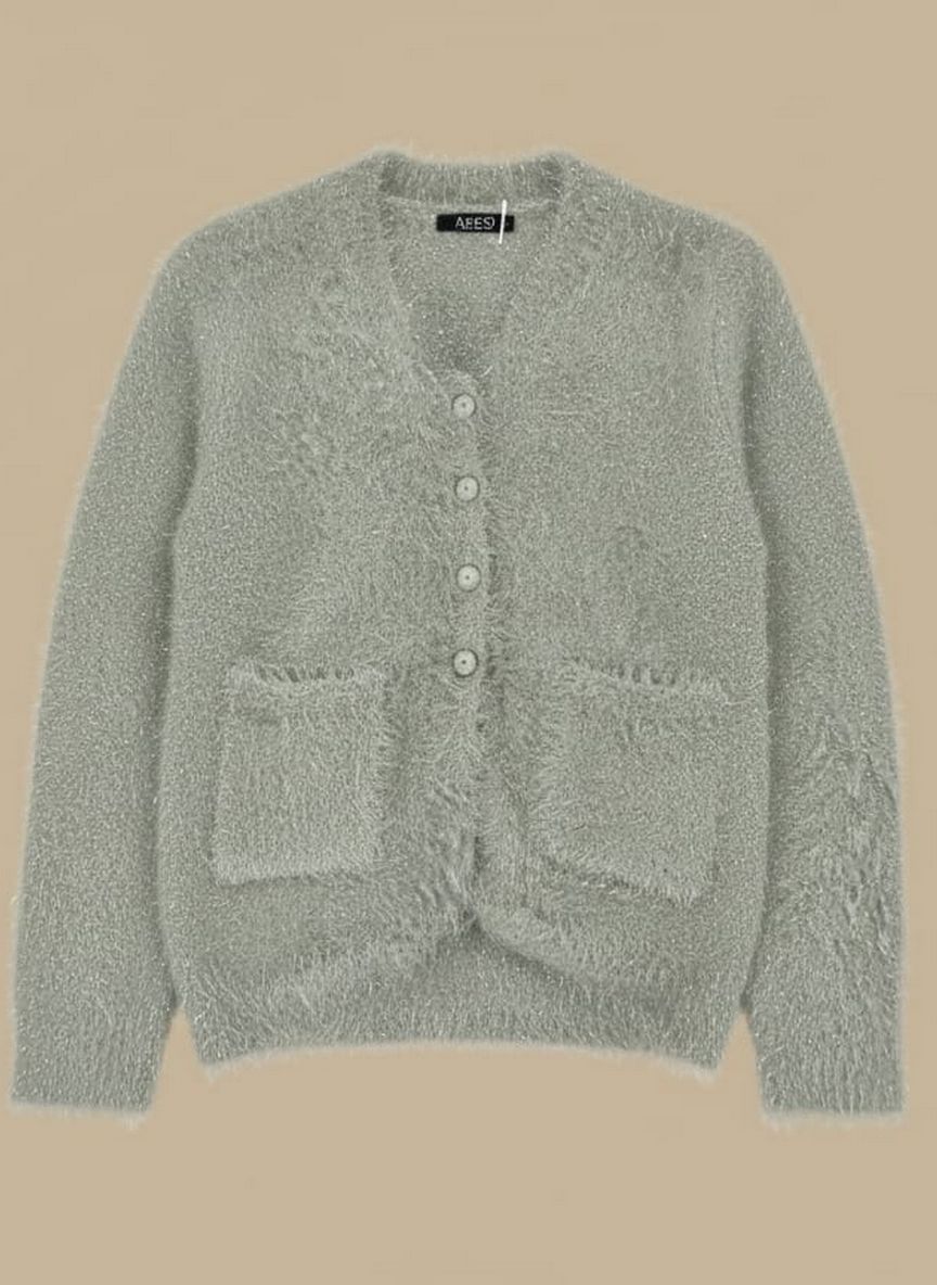 Fuzzy Gray V-Neck Sweater. This charming piece features a unique shaggy, fuzzy knit texture in a lovely light green hue, making it a standout addition to your cool-weather wardrobe. The soft, plush fabric offers exceptional warmth and a wonderfully tactile feel, perfect for snuggling up on chilly days. Designed with a flattering V-neckline and a full button-front closure, it offers versatile styling options.