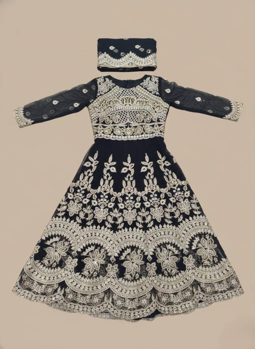 Elegant black net maxi dress for girls, featuring intricate gold embroidery. Perfect for special occasions, this full-length gown offers a sophisticated and comfortable fit.