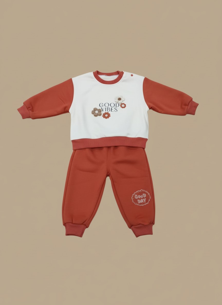 Bring on the “Good Vibes” with this adorable and comfortable baby sweater and jogger set! This charming unisex outfit features a cozy, two-toned sweater in white and rust, adorned with delightful floral appliques and the “Good Vibes” slogan. The coordinating rust-colored joggers complete the look, providing maximum comfort and flexibility for your little one’s adventures. Crafted from soft, durable fabric, this two-piece set is perfect for playdates, family outings, or just lounging at home. It’s an excellent choice for a stylish baby boy or girl, making it a wonderful gift or a cute addition to any baby’s autumn or winter wardrobe. Let your baby spread good cheer in this fashionable “Good Vibes” baby sweater set.