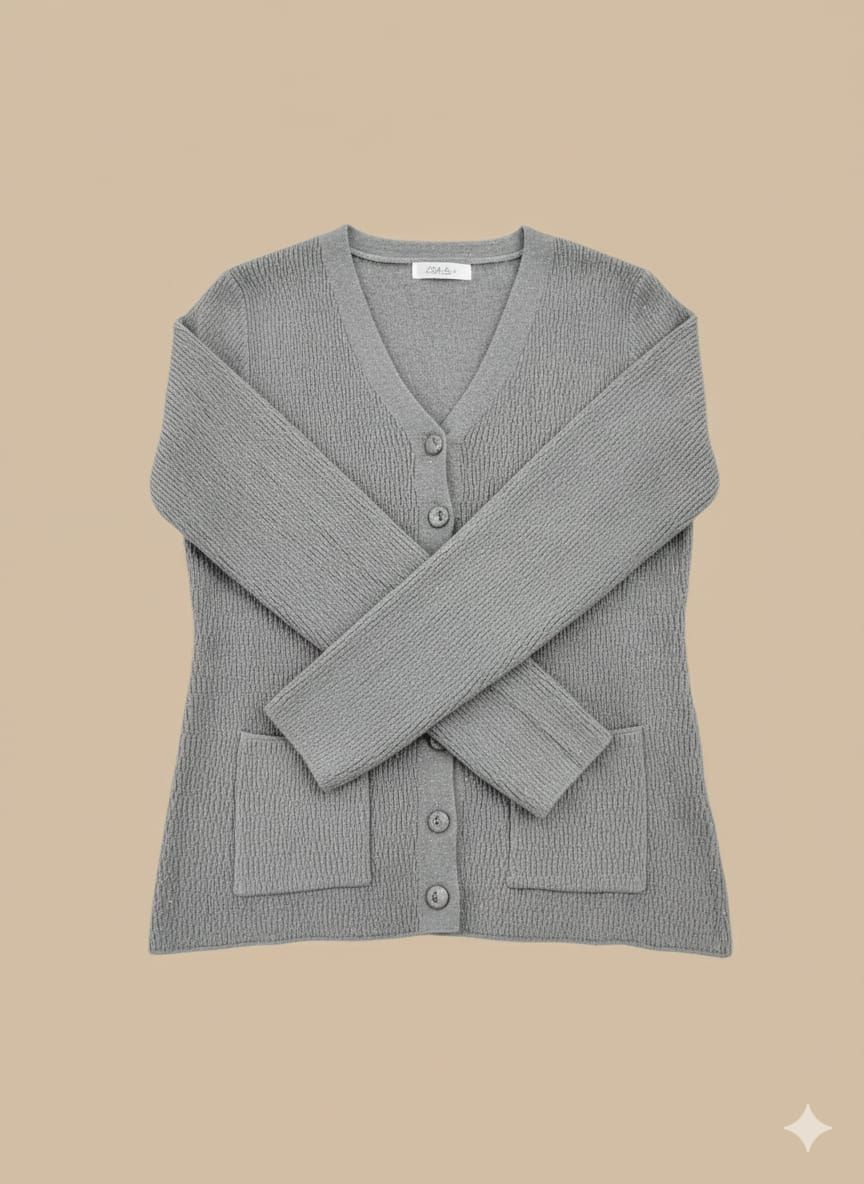 Grey Ribbed V-Neck Sweater. Crafted for comfort and designed for a flattering fit, this lightweight grey cardigan is an essential layering piece for any wardrobe. The delicate ribbed texture adds a touch of sophistication, while the classic V-neck and front button closure offer a timeless appeal. Featuring two practical front pockets, it’s perfect for carrying small essentials or keeping your hands warm.