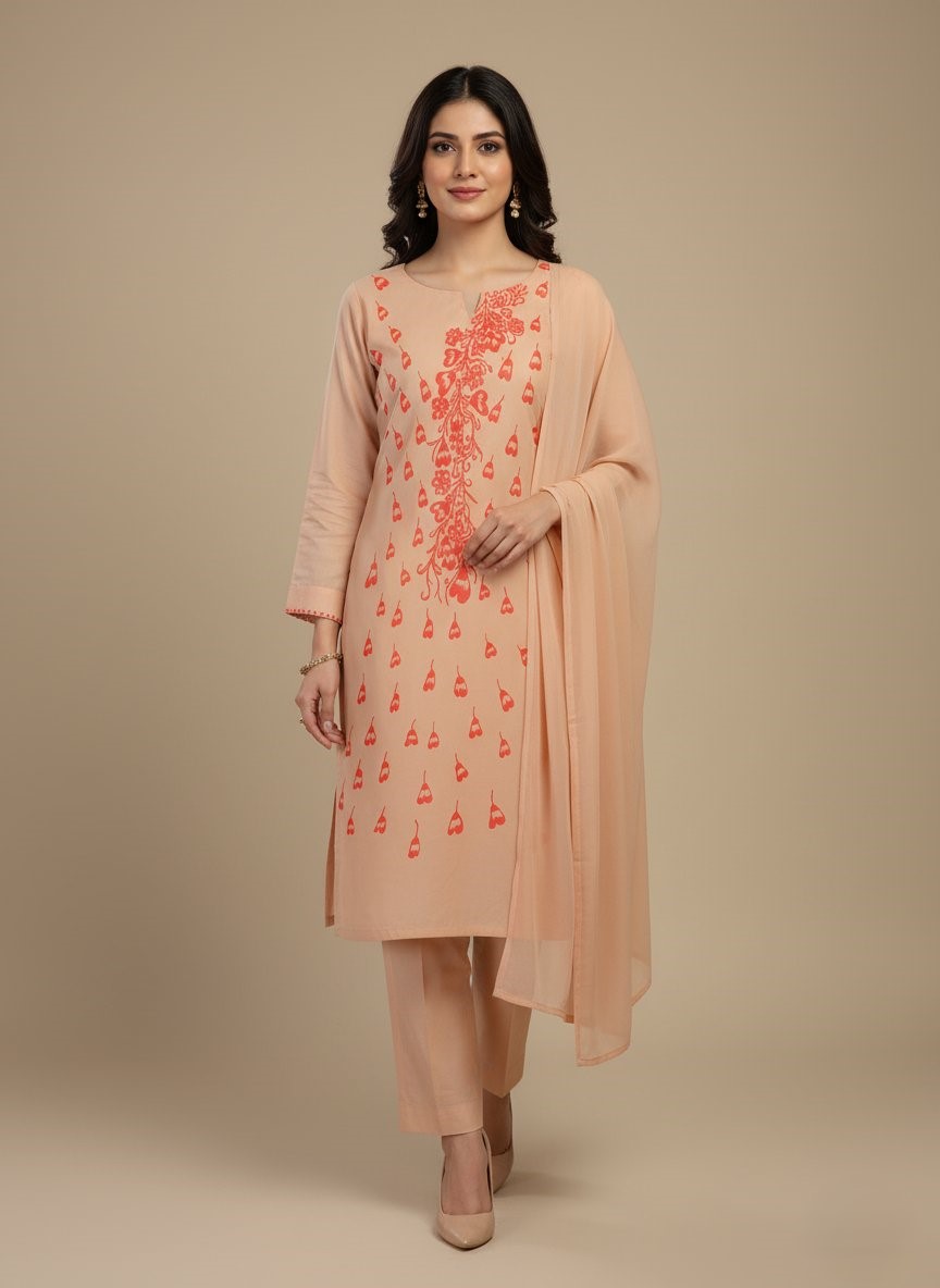 Discover the exquisite artistry of our Hand-Painted Peach Unstitched Fabric, a truly unique piece designed for women who appreciate elegance and personalized style. This 1-piece fabric features a captivating hand-painted design in vibrant red, showcasing intricate floral and leaf motifs that cascade beautifully across the peach base. Perfect for creating a custom outfit like a kurti, dress, or even a statement dupatta. Each fabric is meticulously painted by skilled artisans, ensuring that every piece is one-of-a-kind. Made from high-quality material, this unstitched fabric offers versatility for tailoring it exactly to your measurements and desired style. Embrace the charm of handcrafted fashion with this stunning hand-painted unstitched fabric. Please note, this is a single unstitched piece, ready to be transformed into your next favorite ethnic wear or fashionable garment.