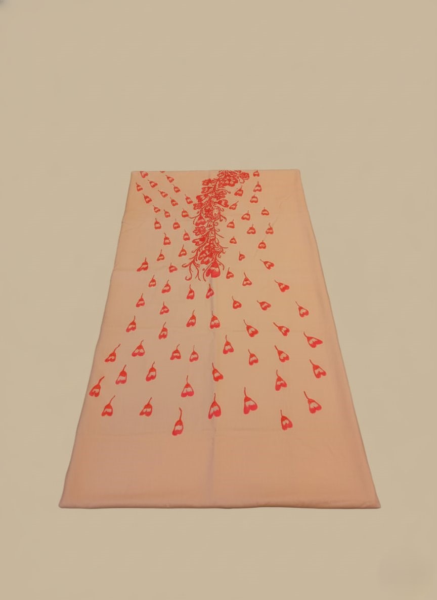 Elegant hand-painted peach unstitched fabric with a vibrant red floral and leaf design. This 1-piece offers unique style for custom women’s ethnic wear.