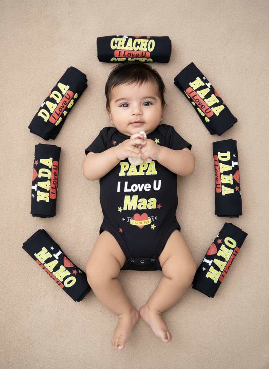 Celebrate family love with our I Love Family Printed Baby Onesie, the perfect outfit for your little one. Made from premium soft cotton, this black baby romper features colorful, loving prints like I Love Papa, Maa, Dada, Nana, Mamo, and Chacho. The breathable and stretchable fabric ensures comfort throughout the day, while the snap-button closure allows for easy diaper changes. Ideal for newborns and infants, this onesie is a thoughtful gift for baby showers and special family photos. Whether it’s playtime or bedtime, this baby onesie keeps your little angel cozy and adorable while expressing love for every family member.