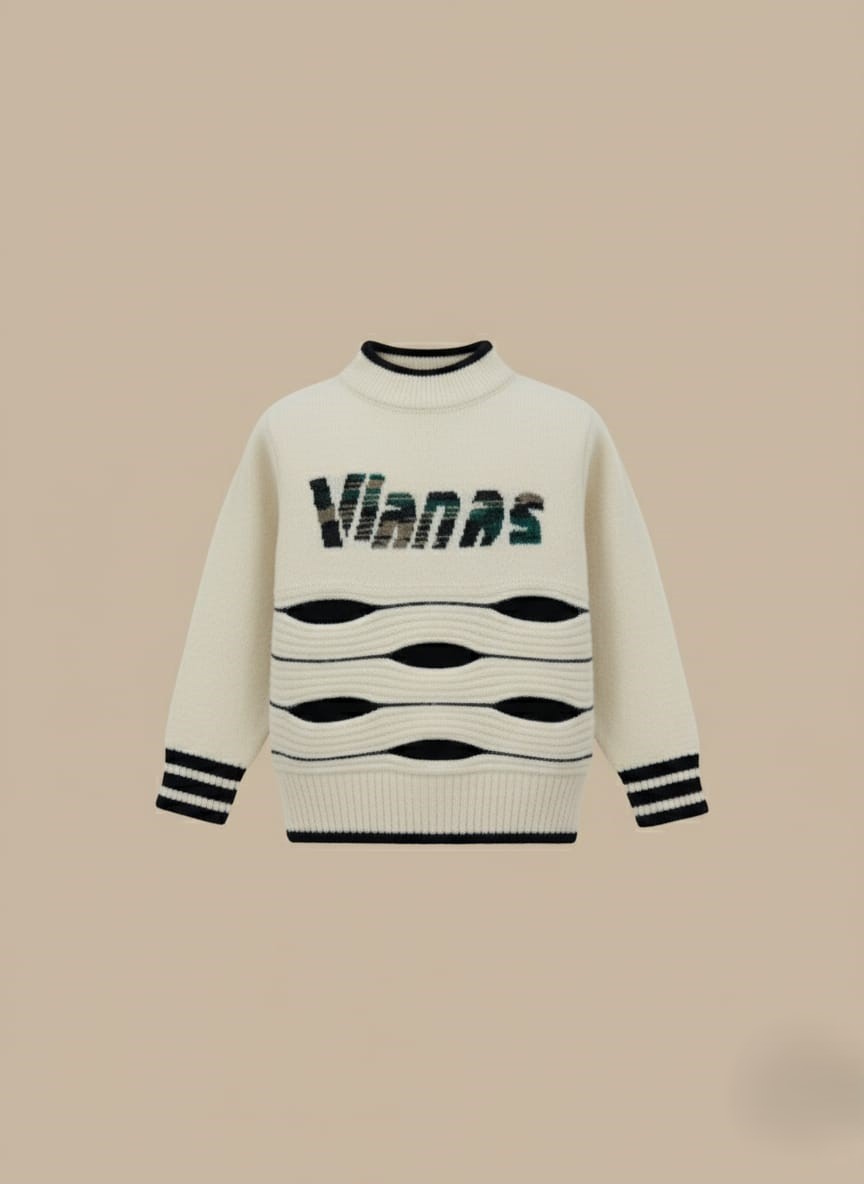 Keep your child warm and stylish in our Kids Graphic Sweater. This cream knit pullover features a bold graphic text, unique textured waves, and contrasting ribbed trim, perfect for a modern and cozy look. A distinctive kids graphic sweater.
