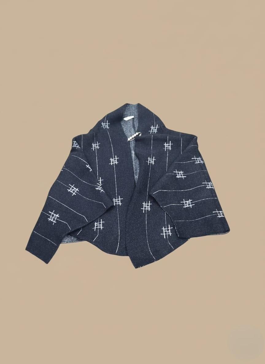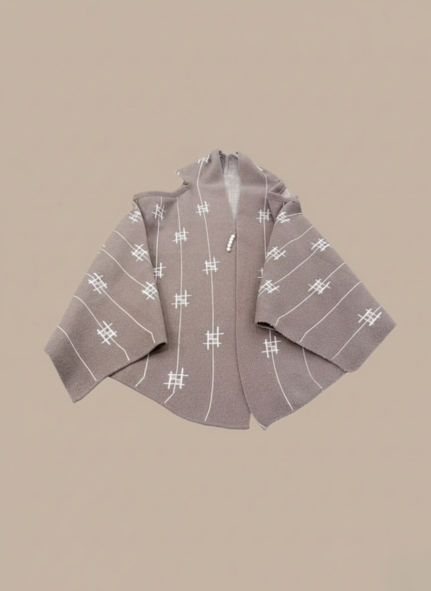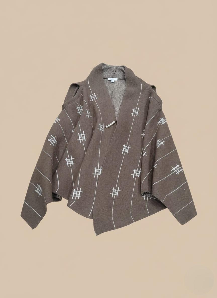 Embrace the ultimate fusion of style and comfort with this stunning knit Capshwal. This unique garment is designed to offer the easy drape of a shawl with the structured silhouette of a cape, making it an incredibly chic layering solution. Crafted from a soft, high-quality fabric, it features a captivating geometric design of white hashtag-like symbols set against a serene taupe background. The open front, wide sleeves, and loose fit ensure comfortable wear and a flattering, versatile drape. It’s the ideal choice for elevating a simple dress, adding warmth to evening wear, or completing a polished work outfit.