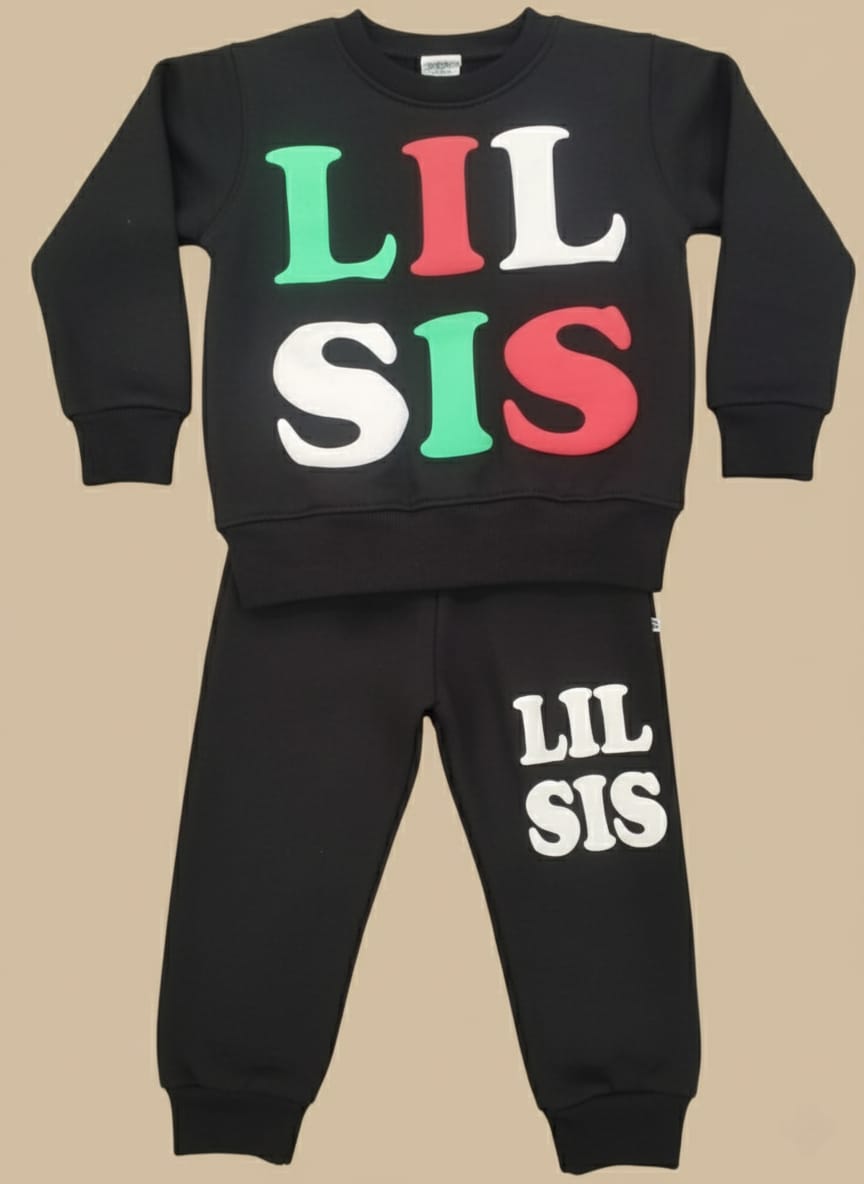 Fun “LIL SIS” Girls Green Tracksuit featuring a colorful graphic sweatshirt and matching comfortable joggers. Perfect for everyday wear.