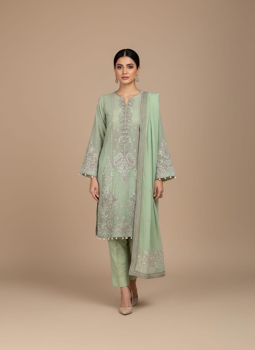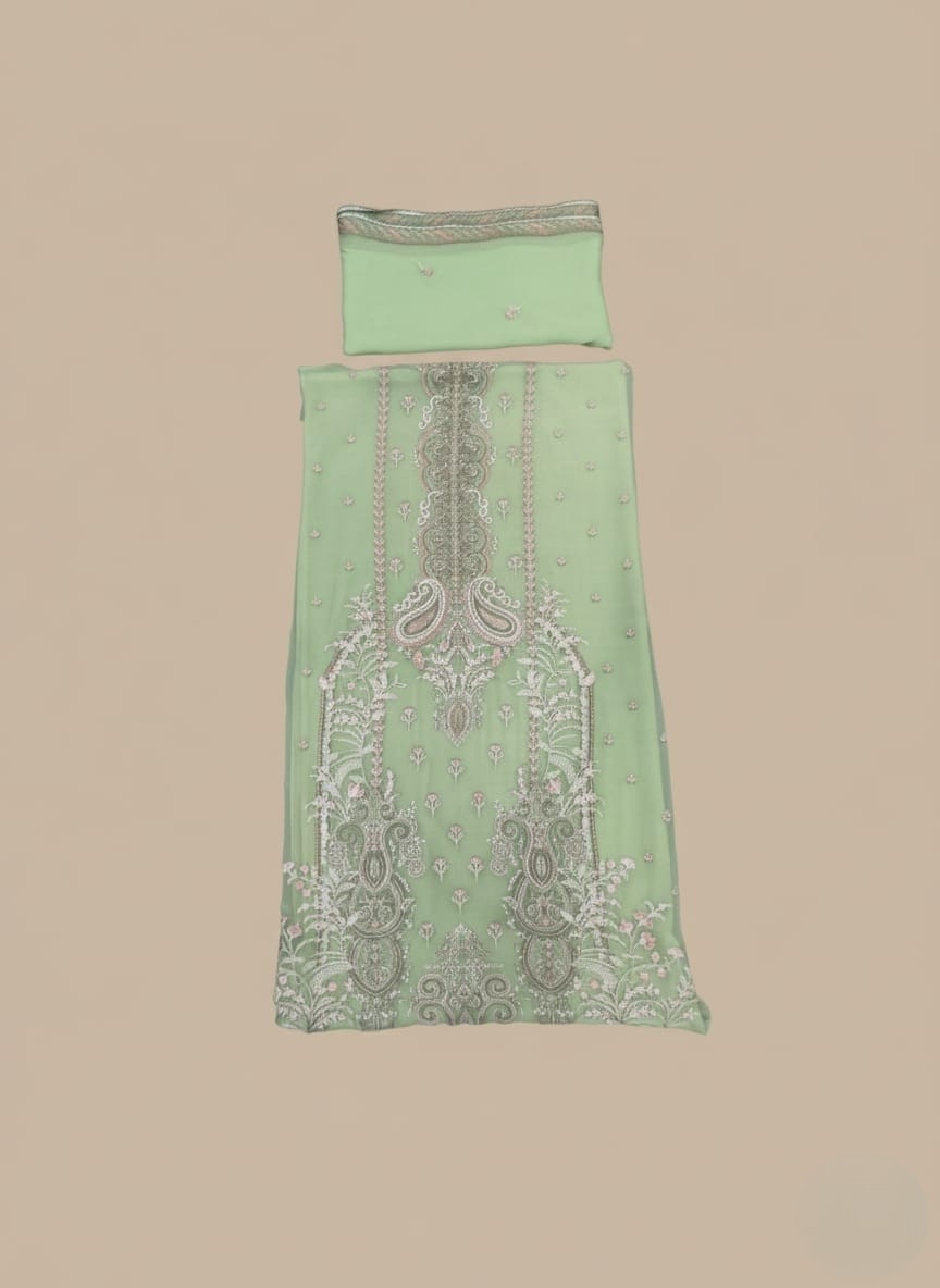 - Step into luxury with this exquisite lime green chiffon embroidered dress, the ideal choice for weddings, major festivities, and sophisticated formal events. This unstitched 3-piece suit features premium, flowing chiffon fabric, renowned for its elegant drape and sheer, light quality.