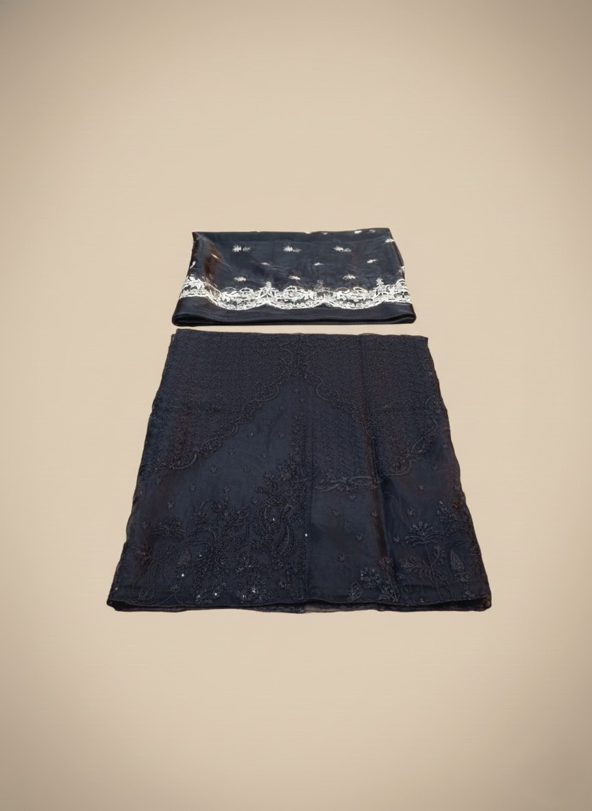 Luxury Black Embroidered Organza Suit with Raw Silk Trouser & Dupatta Pallu 3 PC Unstitched