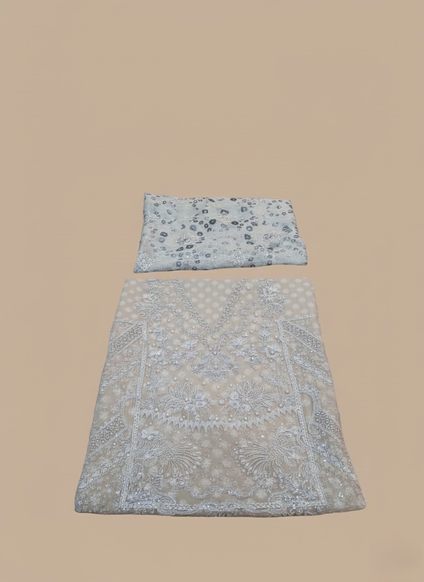 Step into sophistication with this stunning three-piece ensemble, designed for grand celebrations. The centerpiece is the meticulously Embroidered & Embellished Chiffon Shirt, featuring intricate threadwork, sequin detailing, and bead embellishments that capture the light beautifully. The delicate flow of the chiffon fabric, combined with the comprehensive embroidery, makes this piece truly remarkable. This Embroidered Chiffon Dress set is complemented by a graceful Dupatta with Stone Work, adding an extra layer of elegance and shimmer. The dupatta’s soft drape and subtle stonework perfectly balance the heavy embroidery on the shirt. For the lower half, the outfit includes a chic Dyed Printed Raw silk Trouser, which provides a contemporary touch and comfortable fit. A soft and high-quality Raw Silk Inner is also provided, ensuring maximum opacity and comfort beneath the sheer chiffon. Whether you are attending a wedding, engagement, or festive gathering, this ensemble promises a regal and memorable look. Shop this premium Embroidered Chiffon Dress collection today and embrace traditional glamour.